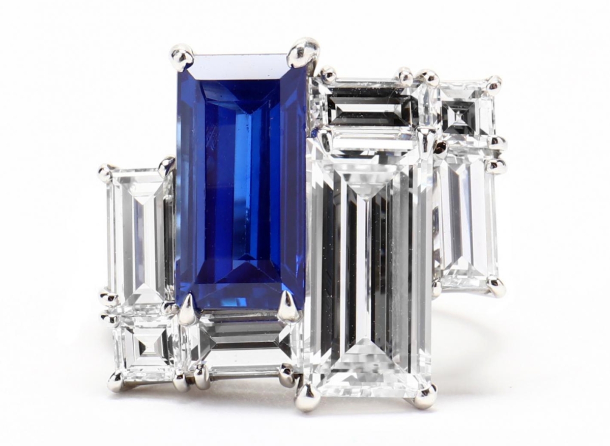 A high-quality Kashmir sapphire and diamond had ten people bidding through the high five figures, and then two continued bidding until the ring, estimated at $40/60,000, sold at $153,400.