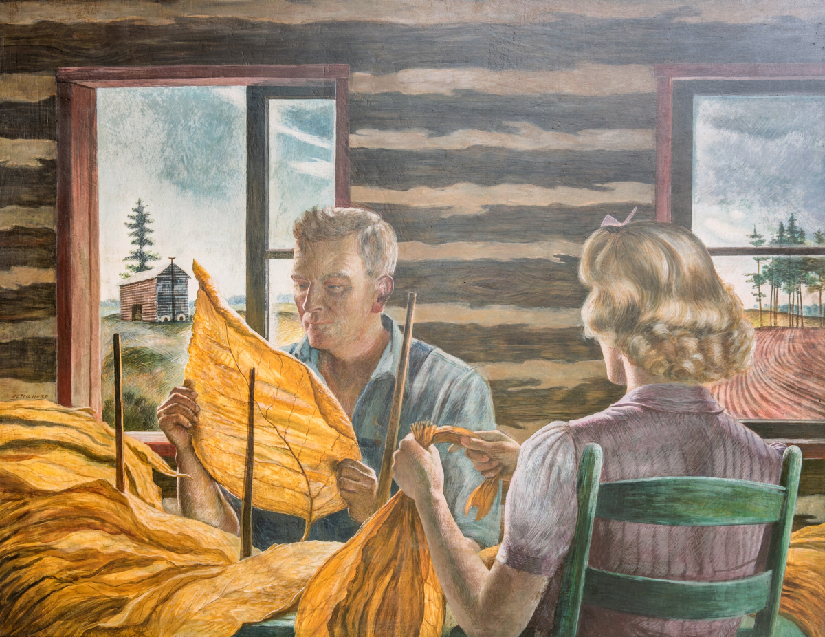 Peter Hurd’s similar ability to wed observed reality to a sense of mythic human drama led to important commissions, some commercial – as in “Grading Tobacco,” made for a Lucky Strike advertising campaign – and some with loftier purposes. During World War II, Peter had the opportunity to revisit his earlier aspirations to a military career when Life magazine hired him to be a war correspondent, embedded with the US Air Force over Europe. Melissa Renn’s catalog essay discusses these wartime works and notes their profound influence on his brother-in-law Andrew Wyeth, whose 1940s paintings of, for example, soaring birds have been connected to a fascination and horror with the destructive power of flight.