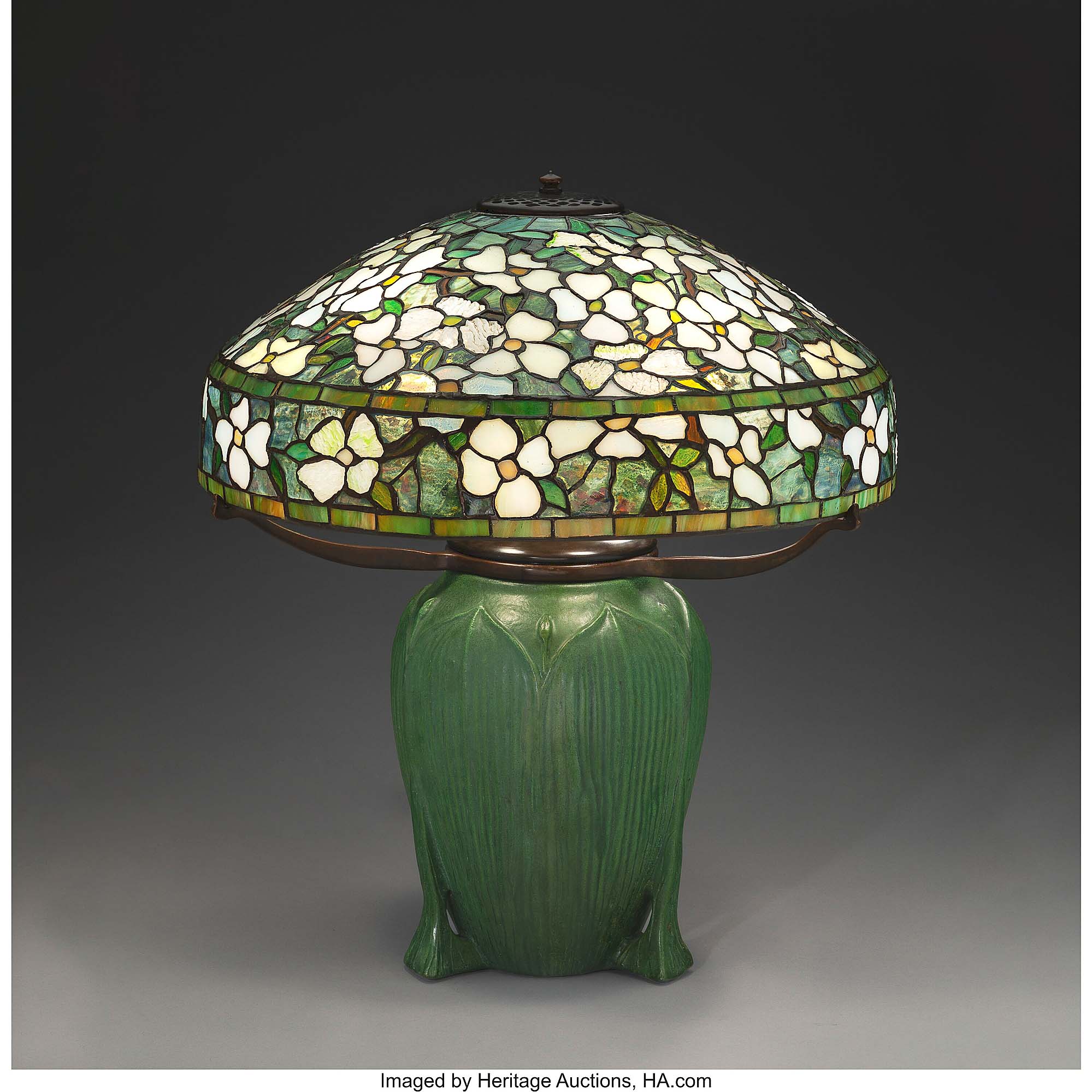This 18¼-inch Dogwood shade by Tiffany Studios, circa 1910, was paired with a vase by Wheatley Pottery, 21 inches overall; it brought $65,625.