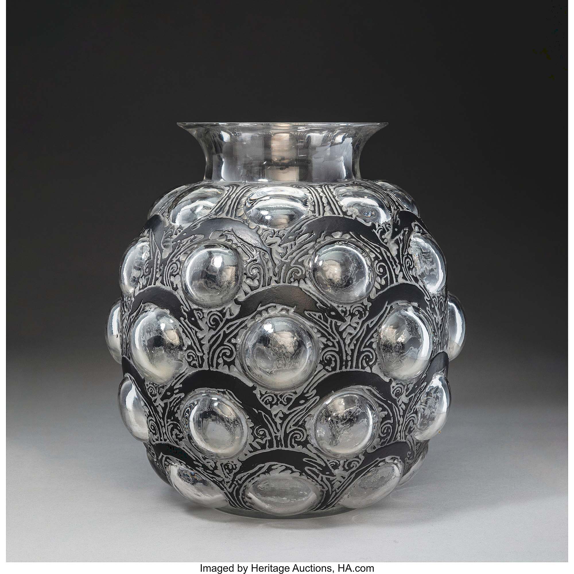 René Lalique’s circa 1925 Antilopes vase, clear glass with black enamel, 11 inches, led the collection of Rex Rush at $21,250.