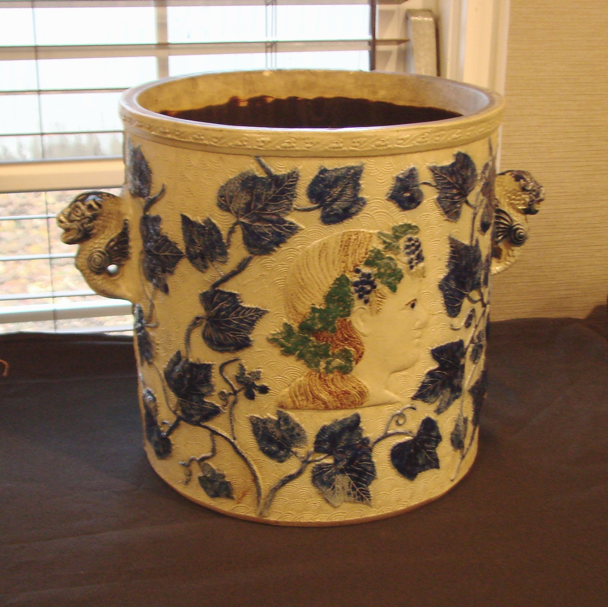 Sam Herrup, Sheffield, Mass., had an exceptional stoneware water cooler, just under 12 inches tall, embossed with a colorful portrait of a woman on one side and a colorful “Rebecca at The Well” scene on the other side. All were surrounded by floral designs, and the molded handles were winged animal heads. It was attributed to White’s Pottery, Utica, N.Y., and dated to about 1890-98. A water filter with similar handles, marked Utica, is in the Munson-Proctor Museum in Utica, N.Y. Herrup said that he had not seen another example and priced the cooler at $1,600. He was one of the dealers who said that participation in online-only shows has been productive.