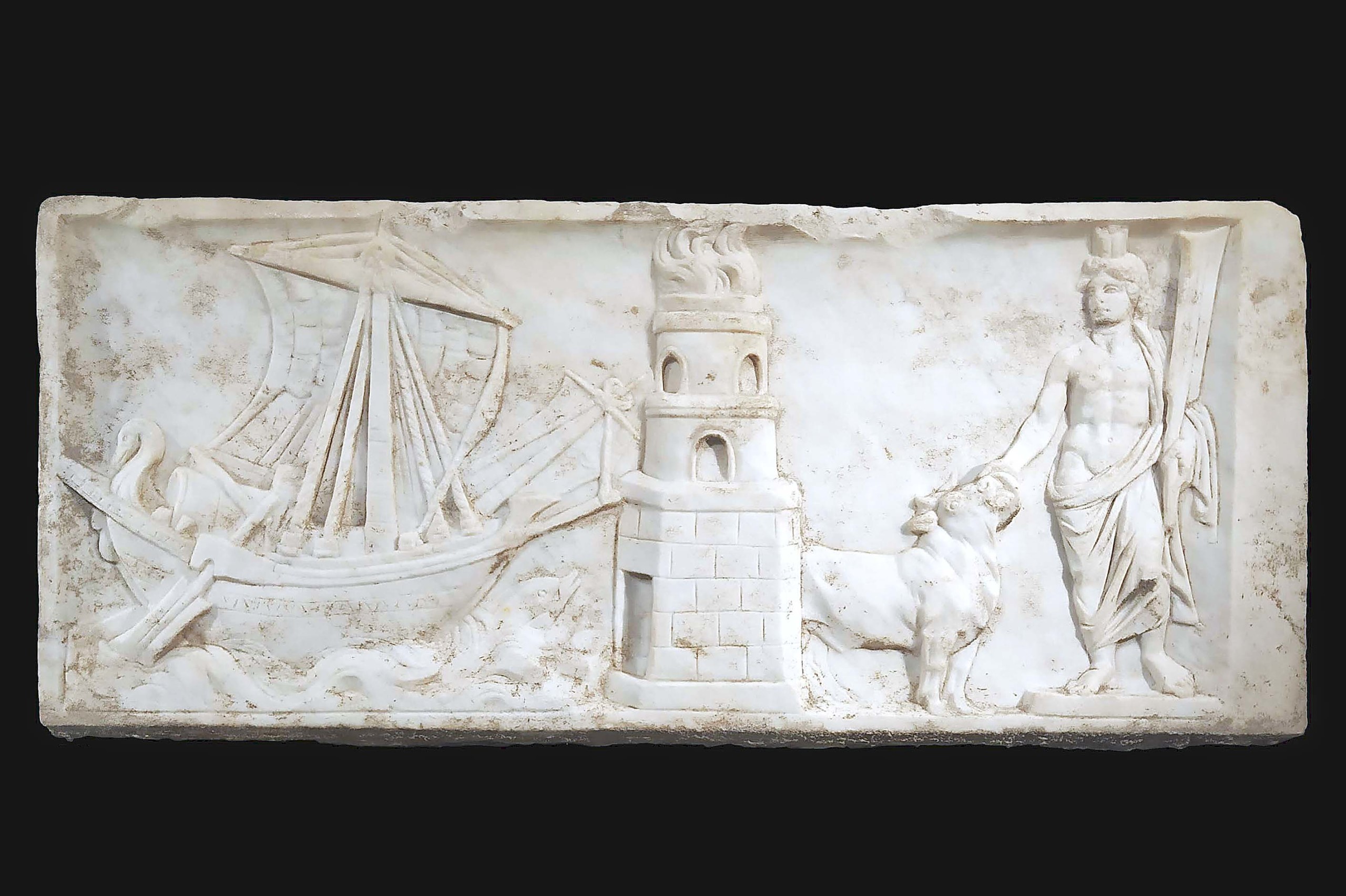 A sense of abundance, of prosperity and confidence permeates the works in the exhibition. A relief with harbor scene and personification of the Port, Ostia, and the statue of Sabina as Ceres, the Baths of Neptune, also from Ostia, exhibit the kind of detail we associate with great care and skill. In the relief, though a storm may toss the ship and its contents, the fire on the watchtower burns bright and the god of the port watches, unconcerned, petting an adoring bull. No intervention will be necessary.