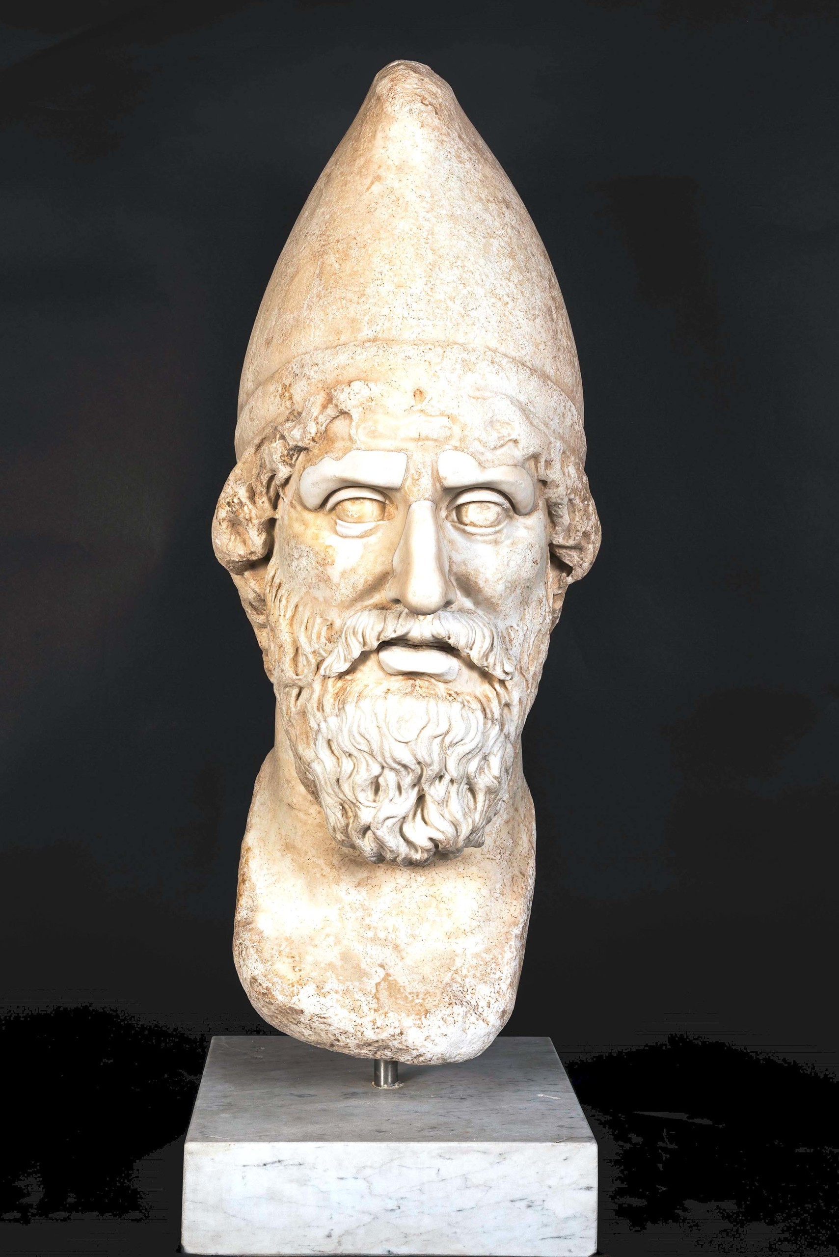 Like everything else, fashion moved from the provinces to Rome and back. When we consider the colossal head of a barbarian with tall pileus, a marble bust carved between 117-38, we don’t see an enemy, an alien, an other. There is no xenophobic exaggeration in the man’s features. His tall pileus only seems to excite curiosity and we can imagine a row of such busts in an early incarnation of a costume institute, each of them adorned with a headpiece from a different corner of the empire.