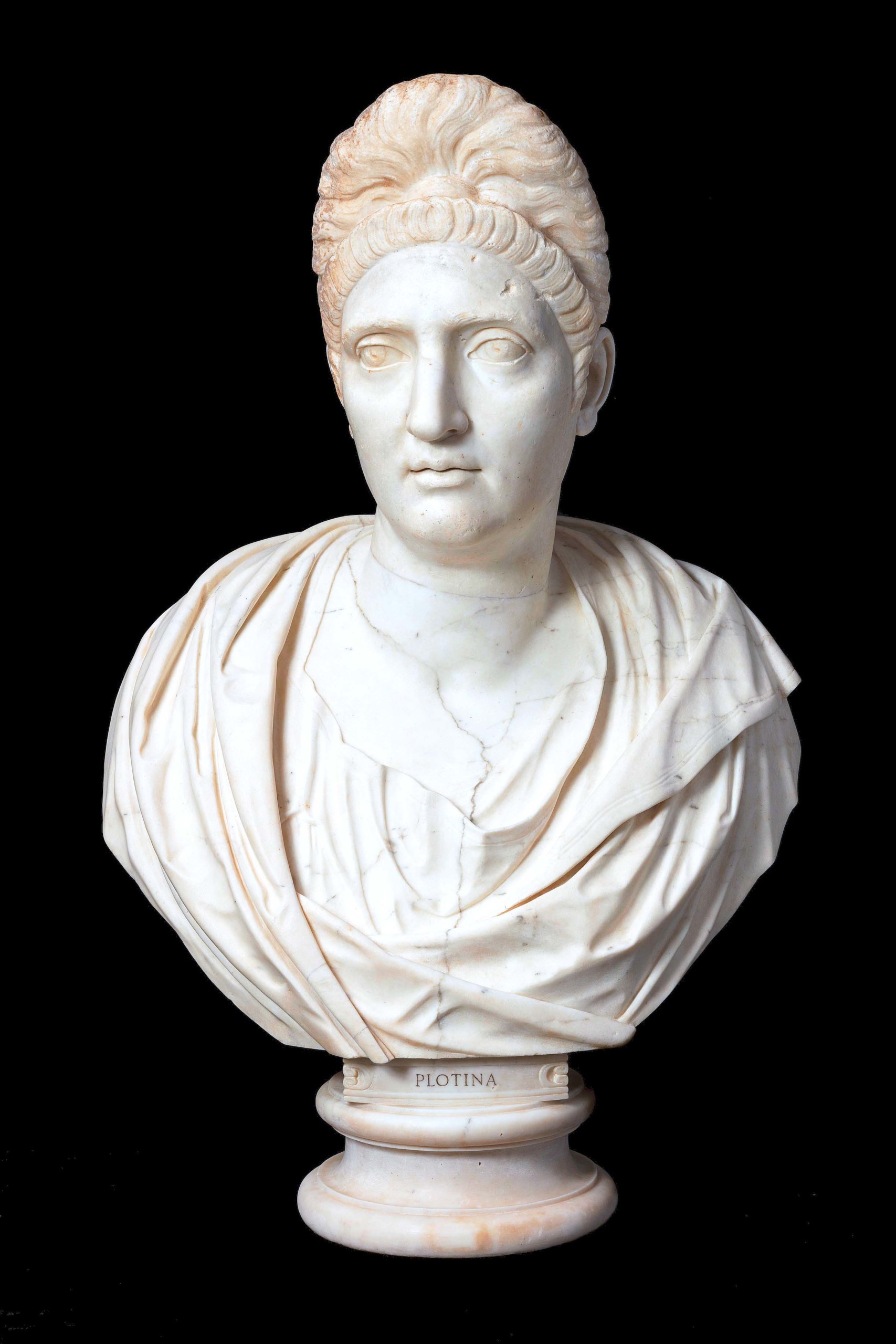Trajan was the second of what historians have called the “Five Good Emperors” of the Nerva-Antonine dynasty. He presided over a period of growth, wealth and relative peace, at least at the center of the empire. The arts flourished as well, and images and ideas from the far-flung corners of the empire made their way to the capital — and to other provinces. Both the Statue of Trajan and the Colossal Portrait of Trajan, executed during or near his lifetime, suggest a fairly ordinary man, open and approachable, someone people could relate to, working hard to seem and ultimately become an emperor. Similarly, the Colossal Portrait of Plotina, Trajan’s wife, who came originally from Gaul, seems well matched with the images of her husband. There is something plain and appealing about them, despite the tone of austerity in their faces.