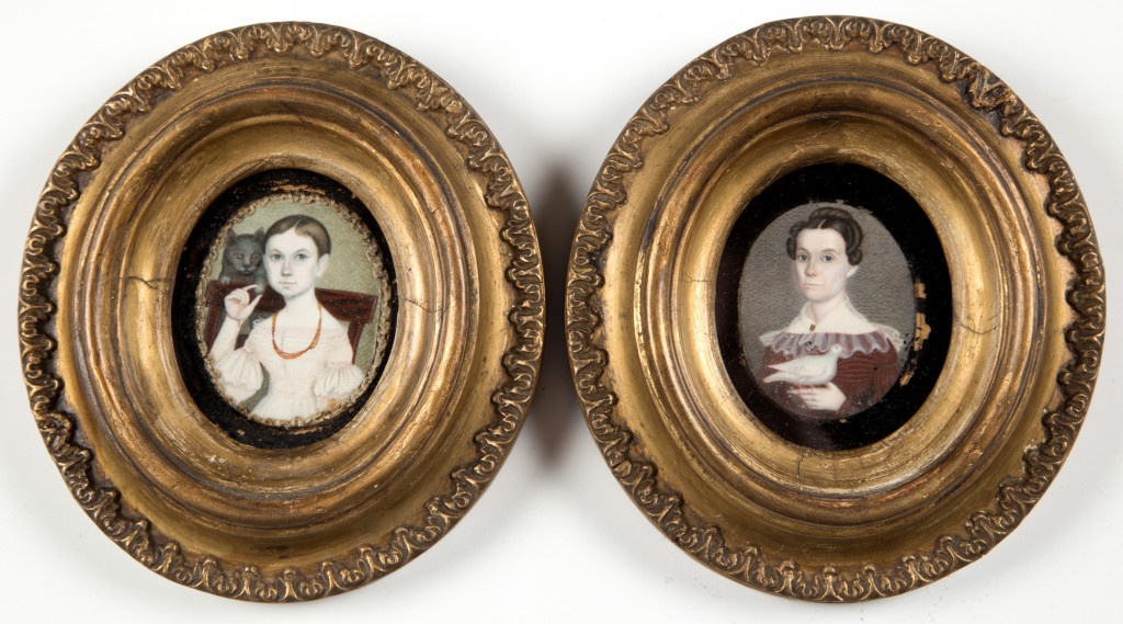 The daughter is shown with a painted tablet-top side chair with a gray cat perched on the back, the mother is holding a white dove. They are identified verso as Mary Jane Mason and Emma Harris Mason, said to be members of a Dauphin Country, Penn., family, circa 1830. Each is housed under glass in a period oval gilt frame retaining its period printed “J.W. Sargeant” framer’s label verso, possibly with the original poplar backboard. Each portrait is 2 1/8 by 1¾ inches.