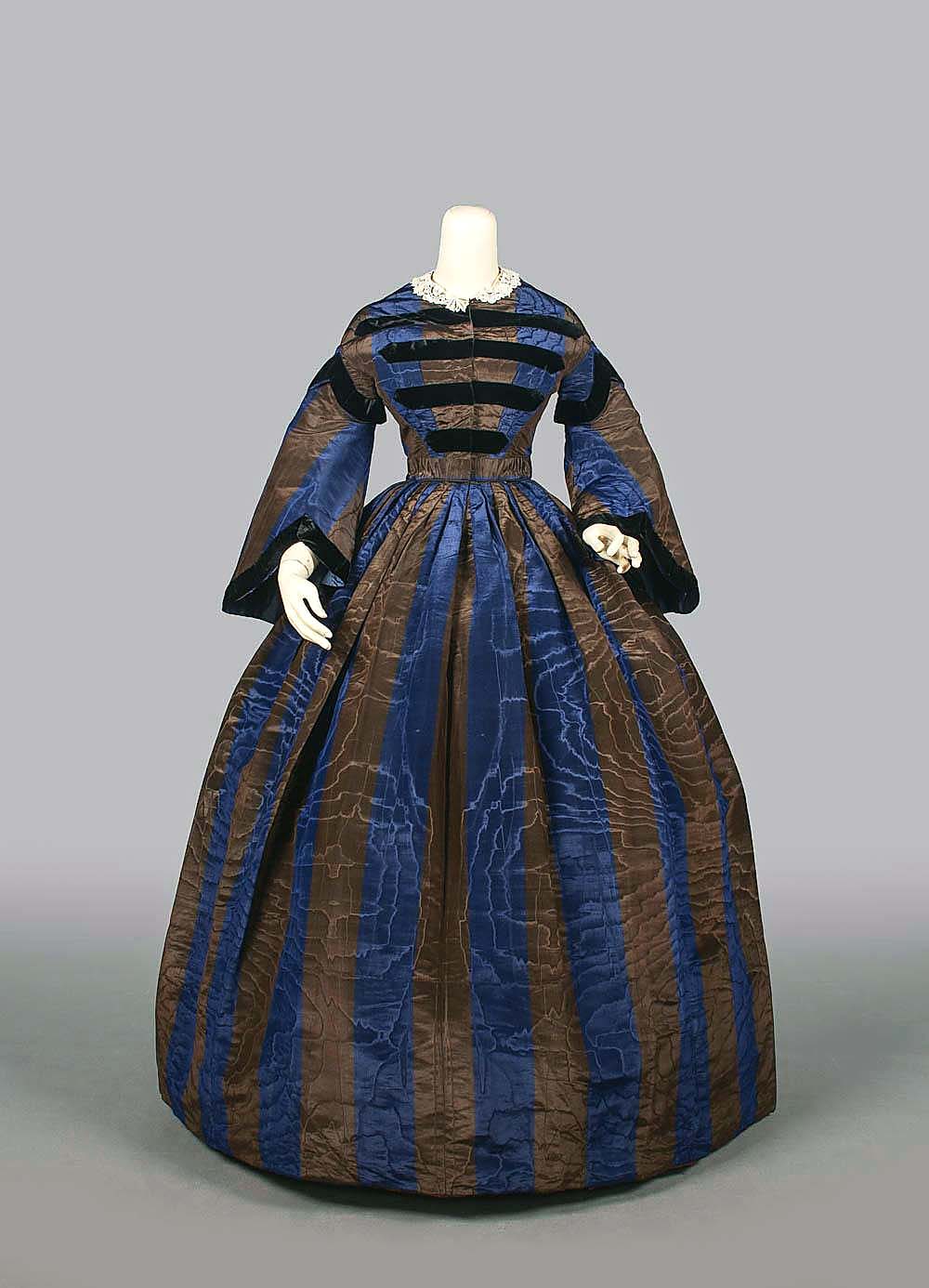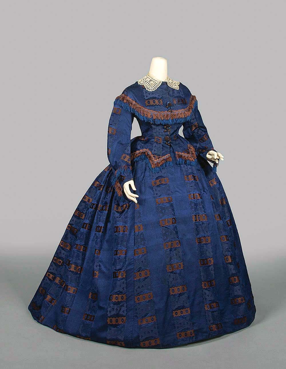 Two mid Nineteenth Century gowns from the Valentine Museum (Richmond, Va.) also found unexpectedly high favor with bidders. First was a blue and brown striped moiré gown with military-inspired black velvet appliqués on its bodice. The gown’s bell sleeve caps and cuffs were also trimmed in velvet, it showed a tape lace collar and achieved $3,375. Second was a silk and satin afternoon dress in two pieces, entirely handmade circa 1854 and updated for sleeve style in the 1860s. Its collar was also tape and needle lace, showed intact applied fringed silk passementerie and sold for $1,875.