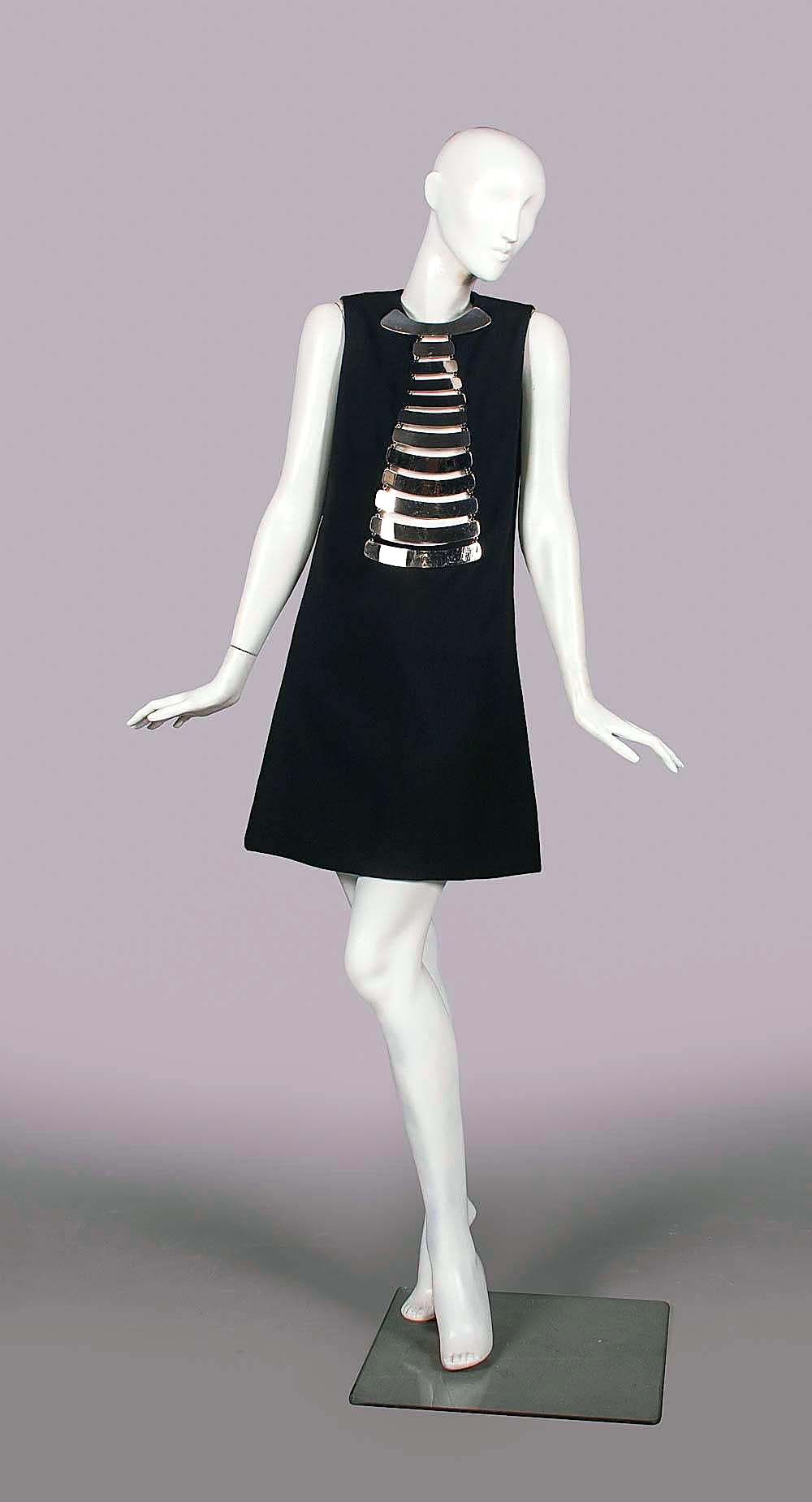 Perhaps more aligned with McQueen’s spirit was a “ribcage dress” from Pierre Cardin, 1969, that followed the Schiaparelli jacket in price at $3,625. The sheath was made with wool crepe and metal plates stitched in to form the “ribs.” It showed some wear yet was also assessed to be in very good condition. This jacket too had a twin in another institutional collection and was acquired by the Museum of Fine Arts, Boston.