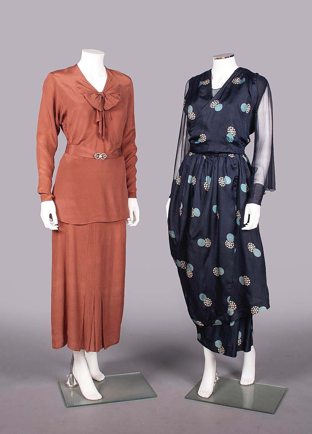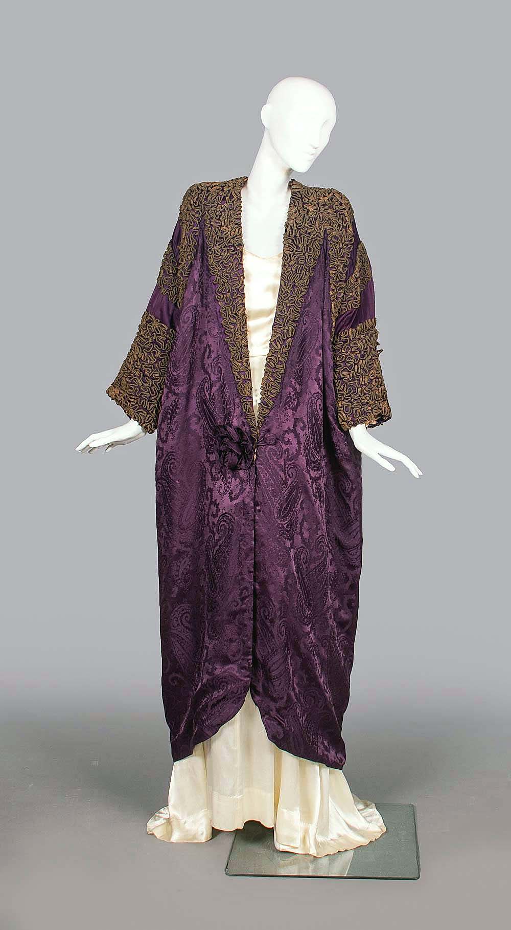 Opera coats from this era also appeared in the upper ranks. One of the auction’s featured pieces was from the French designer Dorat: a black silk satin cocoon coat showing floriate designs with embroidered seed pearls. It also sported an alluring black velvet collar. The coat’s exterior condition was excellent but shattering on the lining was poor. Nonetheless, bidders more than tripled its high estimate to $2,875. Next in price was an even earlier Babani, Paris, coat from the 1910s. Its patterned purple silk was accented with standing lamé appliqué in a vermicelli motif. Despite tarnish and minor damage concurrent from being over a century old, the coat was considered in very good condition and sold for $2,000.