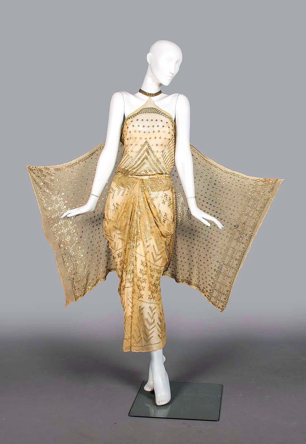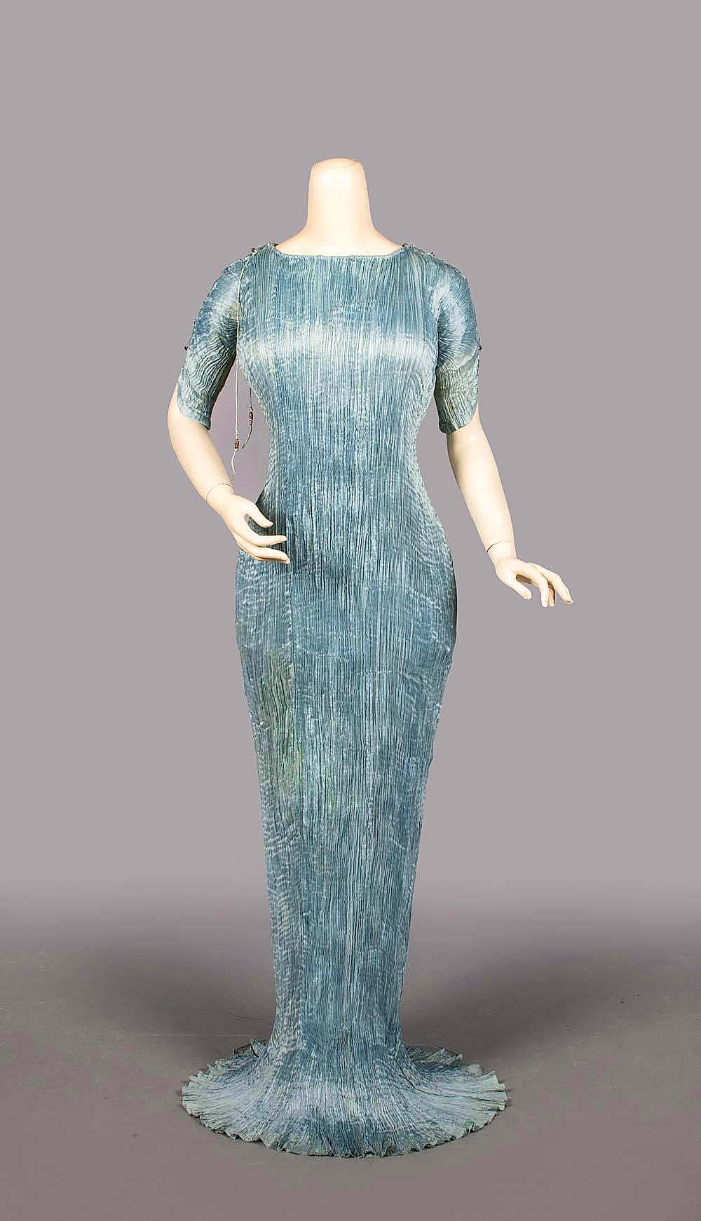 Second was a departure from its Fortuny bookends, a 2007 Skeleton Fairy gown from Alexander McQueen. The floor-length sheath dress was made from black silk crepe-backed satin, showing a fantastical printed image of skeletons with fairy wings flying around a turreted castle, revealing a plunging back on the reverse. McQueen, who died in 2010, is best known by his sculpturesque haute couture gowns and ubiquitous black scarves screen-printed with skulls. The style was shown in the Museum at FIT’s “Fairy Tale Fashion” exhibition (January-April 2016); this example was bought for $16,875.
