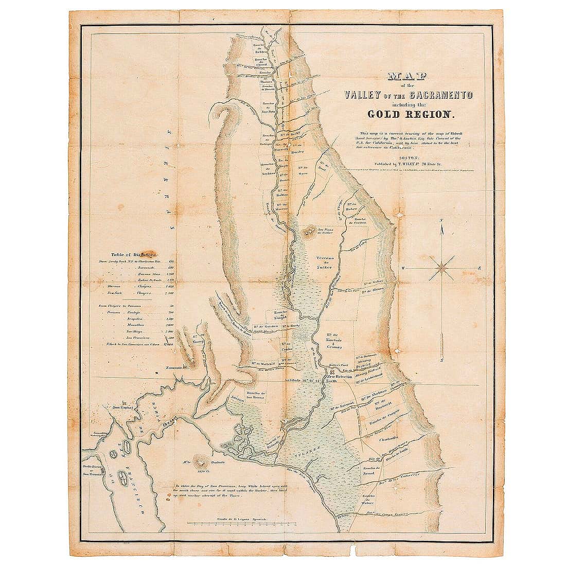 $24,000 was the highest price between both sales and was awarded to Map of the Valley of the Sacramento including the Gold Region, a hand-colored, lithographed map by Thomas O. Larkin (1802-1858) printed in Boston circa 1848 ($20/30,000).