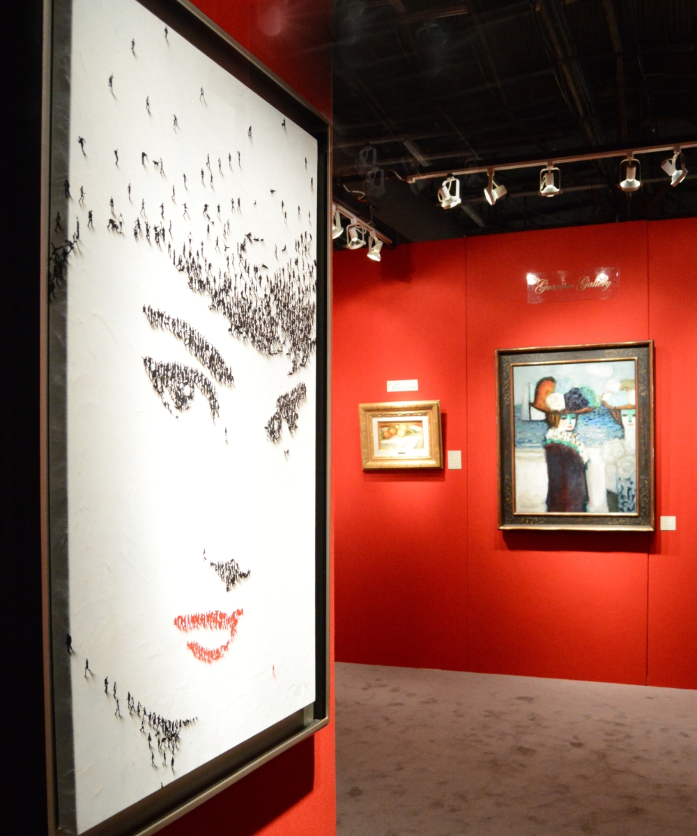 The artist Craig Alan’s large portrait of Audrey Hepburn, composed of hundreds of tiny painted people, was eye-catching at Guarisco Gallery, Washington, D.C., while coincidentally, across the show floor, The McLoughlin Gallery, San Francisco, also had a Hepburn portrait on view, this one by Jerome Lucani, a photographic survey made up layers of smaller related and biographical images.
