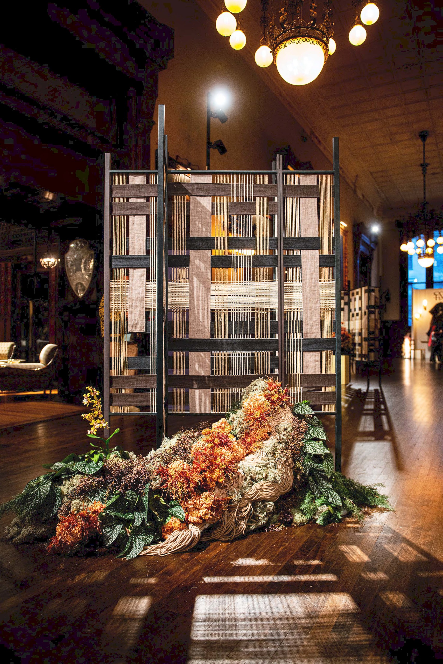 One of the most prominent site installations, presented in the entryway and halls of the Armory to be seen by all as they entered, was conceptualized by Virginia Harper of Virgina Harper Design. Harper described “Global Threads” as “a sculptural environment that explores how art, craft and human connection intertwine.” The installation featured suspended woven screens made of cord and fabric, and Harper said it “became a true point of connection; visitors were immediately curious about the woven screens and the participatory element of taking a thread to wear as a bracelet.” The entryway location of this presentation was “a dream, as I had the chance to connect with almost everyone coming through, including collaborators I’ve worked with over the past couple of decades,” she added. “It has truly become my favorite fair because it celebrates the more artistic, craft-driven, tactile side of design.”