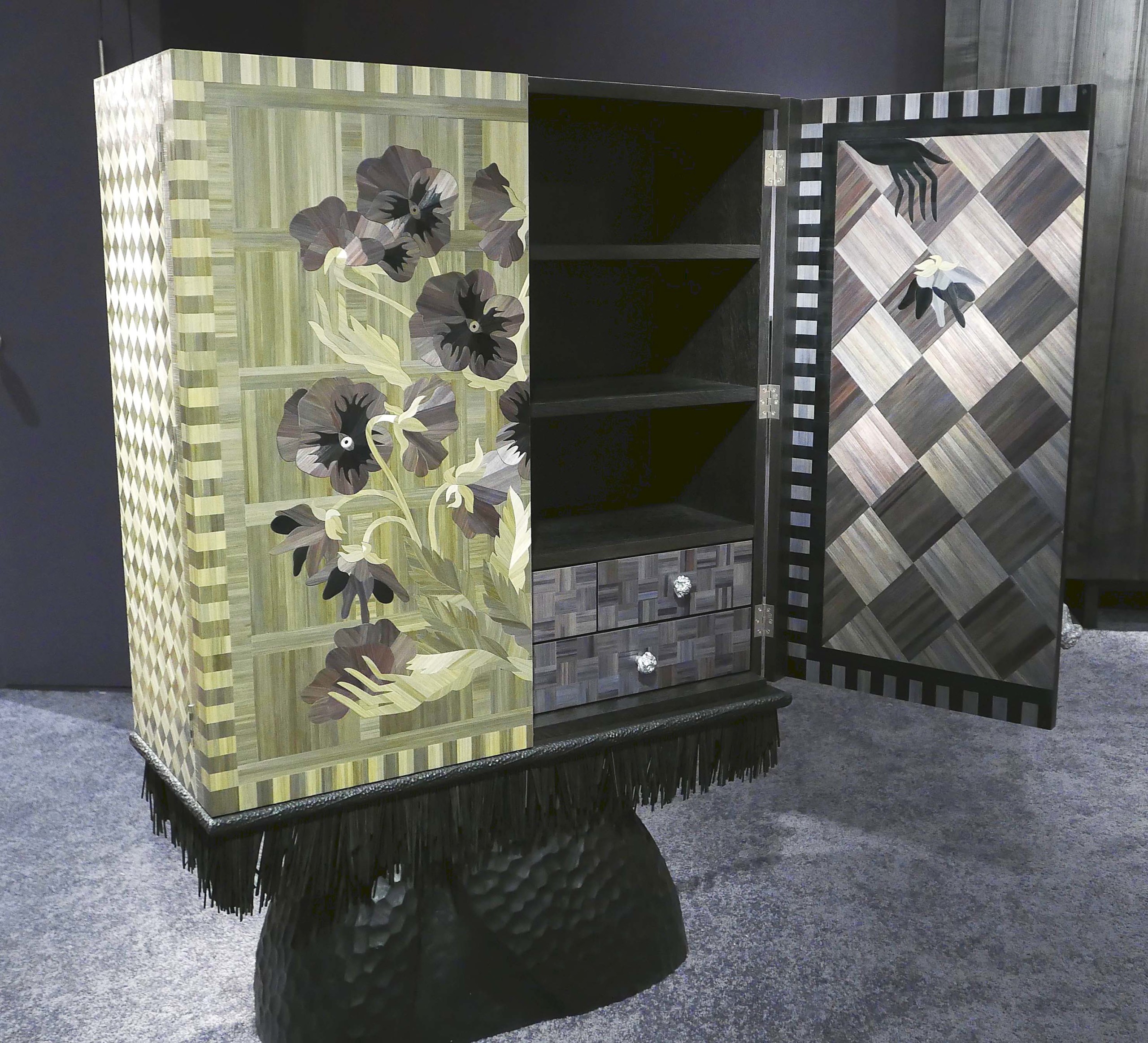 De La Vega’s installation of Rugged Modernist furniture, many examples with coquille d’oeuf marquetry came to life with the live onsite demonstration by artists. New York City.