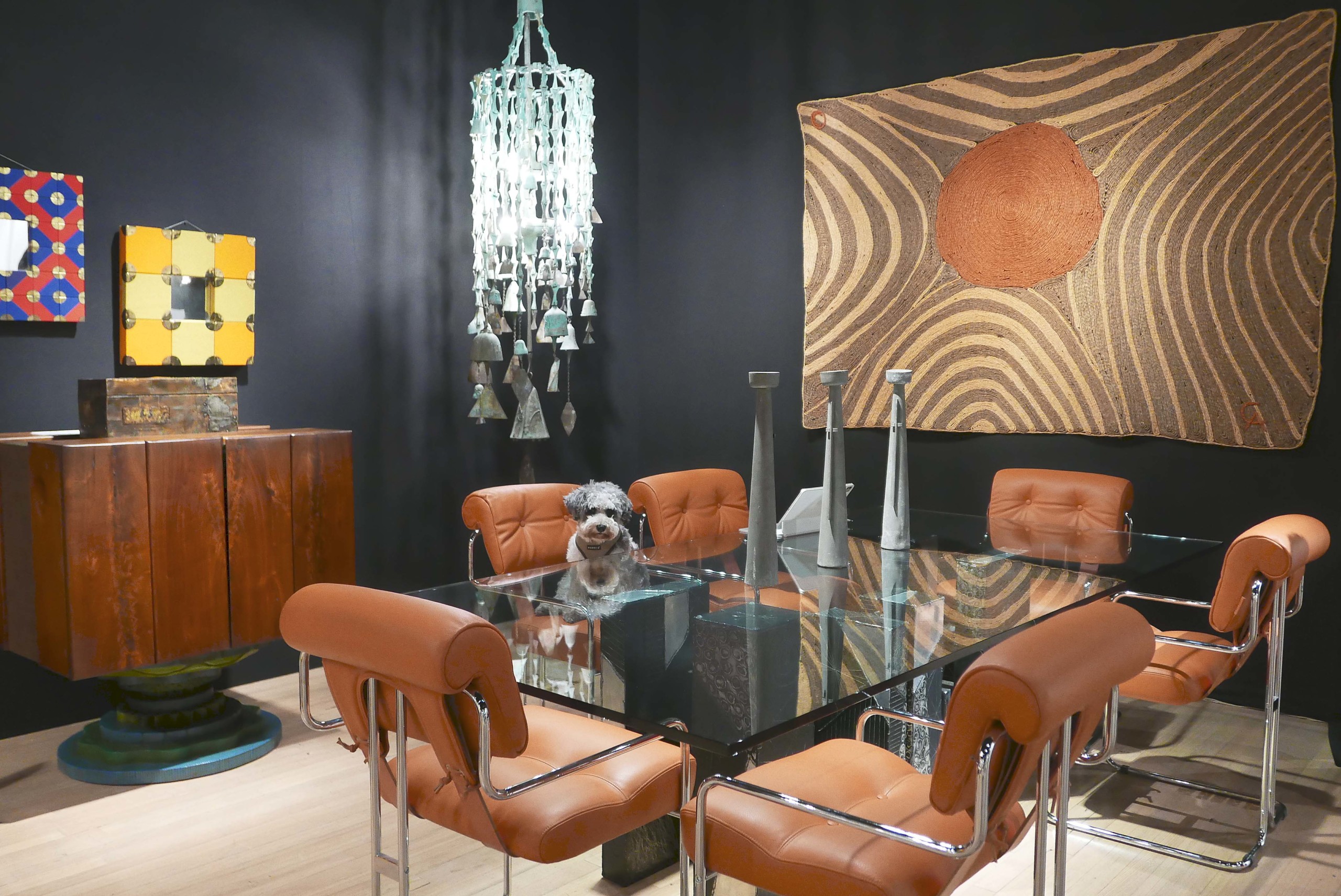 Exhibitors throughout the weekend reported continuous foot traffic from knowledgeable and discerning collectors. Juliet Burrows, co-founder of the New York City gallery Hostler Burrows, noted having a great experience at the show, saying, “It was extremely well attended, both at the opening and over the course of the following days. This is our first year back after a few years’ hiatus, and the show definitely felt strong, and many clients expressed that they thought it was a strong edition for the fair as well.” Hostler Burrows’ booth, primarily focused on Nordic design and contemporary art, generated significant interest from buyers. Burrows shared that a blown glass light box installation by Tobias Møhl, Gal Gaon’s “Rings” dining table and Kim Simonsson’s ceramic sculpture flocked in green were the greatest attention-grabbers. The Møhl glass works were among the sales that she reported, also noting a pair of vintage shearling chairs and a terrazzo coffee table, adding that most pieces sold to new clients.