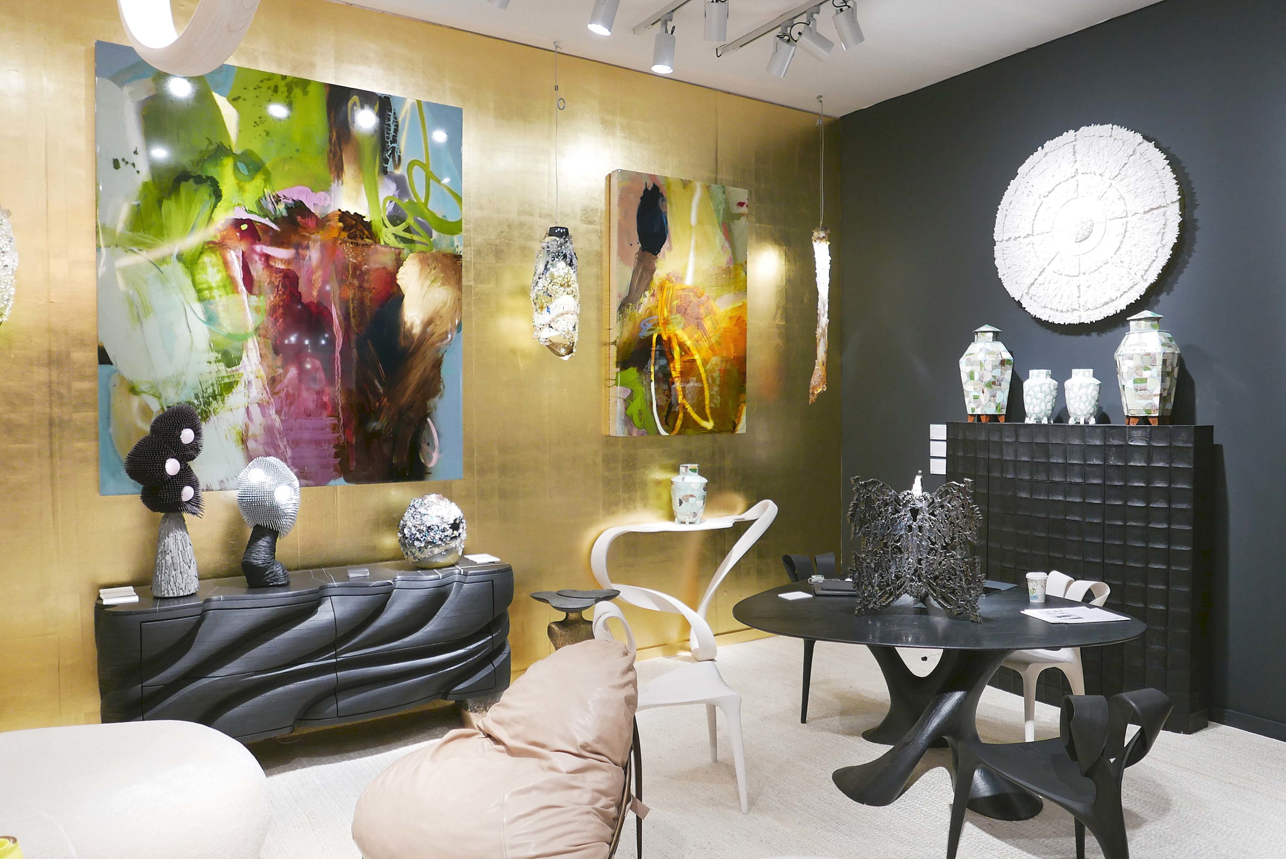 Todd Merrill Studio, based in New York City, was back again, showcasing a curated selection of contemporary fine art, sculptural lighting and collectible design from leading international artists across North America, Europe and South Korea. Todd Merrill shared, “This year’s Salon far exceeded last year bringing top decorators as well as established and new clientele. Opening night sales included a large LED light sculpture by artist John Procario for $55,000 to be followed by the sale of the sofas designed and made by John Procario.” In addition to the notable sales, highlights were “three large paintings by Aurel K. Basedow, the largest of which sold at the beginning of the fair. Clients gravitated to the ‘Pure Black’ series by British artist Ian Spencer, the ceramics wall installations by Molly Hatch and Mindy Horn as well as the spectacular lighting by German artists Pia-Maria Raeder and Markus Haase.”
