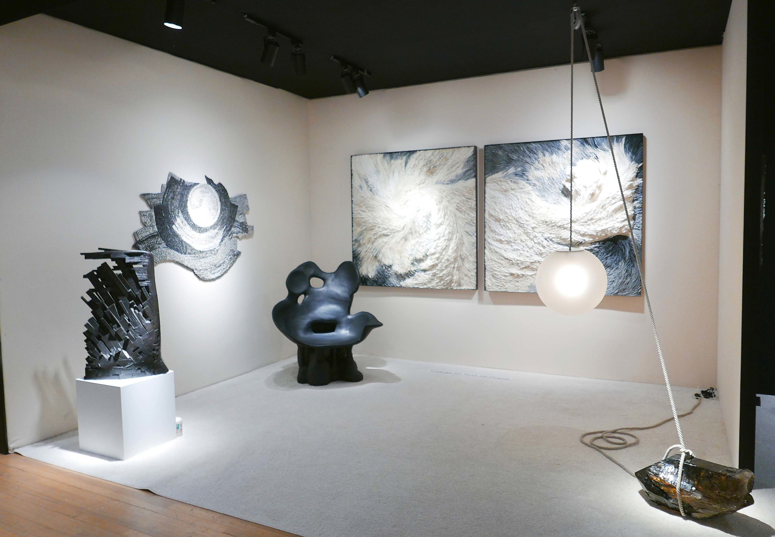 Mia Karlova Galerie, Amsterdam, sold the Black Mirror Metamorphosis Chair and the pair of porcelain “Nexus” panels shown at the back of the booth.