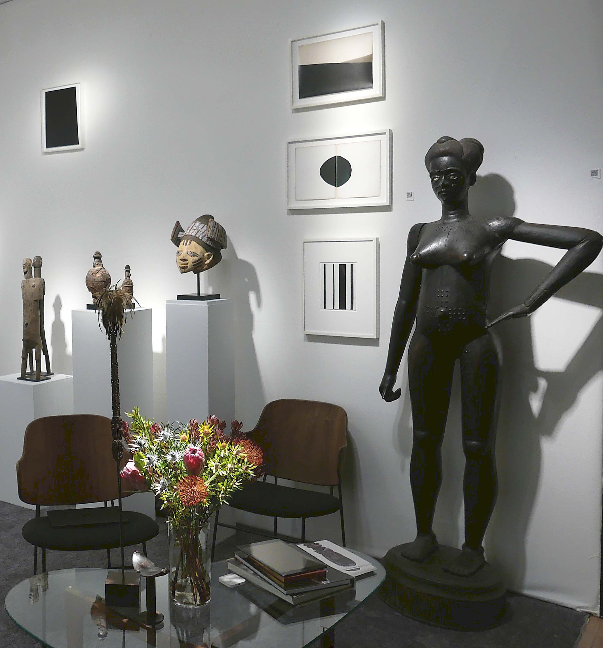 Misgana African Art, founded by Seble Asfaw, made their successful Salon debut, presenting Nineteenth and early Twentieth Century artifacts such as Kongo-Woyo and Dogon masks, Luba staffs and Baule figures alongside contemporary abstract paintings by Touré Coffey. The booth display, designed in collaboration with Rahel Semegn of Abé Interiors, highlighted how Asfaw seamlessly incorporates African artifacts into contemporary design, celebrating the craftmanship of each object. As a result of the striking presentation, Salon Art + Design x Galerie awarded Misgana African Art with the Emerging Talent award. Following the show, Asfaw reported having an “incredible” and “busy” show, saying that a new collector purchased a black-and-white painting by Coffey and there were several active follow-ups on several African works, including a Bamana mask and the Luba staff. She noticed that collectors had a “strong appetite for integrating traditional African objects alongside contemporary furniture and art, especially pieces with clear form and presence that read well in modern interiors,” adding that “Younger collectors were curious and asked thoughtful questions about use, region and care.”