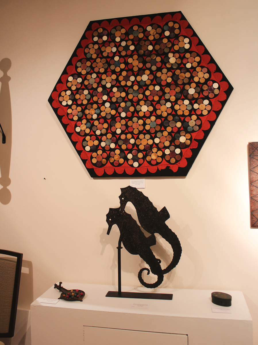 One of the two booths facing the divider between the upper and lower levels of the show, Kate Alex said she “sold lots of stuff.” That stuff being garden decorations, urns, iron chairs, folk art, weathervanes and a beaded chandelier. The Warner, N.H., dealer said all of her sales on the first day of the show were to new clients, including many from the Midwest, California and Chicago.