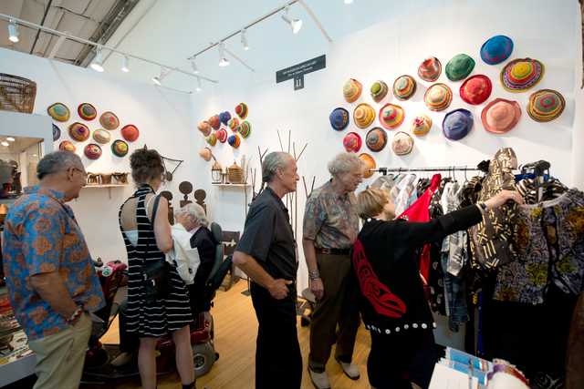 Inside the booth, more than a dozen framed works on paper by Larry John Palsson hung in colorful profusion next to large Tonala pottery vases from Mexico and a pieced and appliquéd quilt. Palsson and Compton’s role in popularizing the late Seattle Outsider artist have been chronicled by Raw Vision and Art and Antiques magazines. By Saturday, Compton had sold three of her nine 1930s to 1950s Tonala vases. “One went to a gal from San Antonio, Texas. She asked, ‘Can you ship this?’ I said, ‘I’ll do better. I’ll deliver it. I live about an hour away,” Compton recalled with a smile.