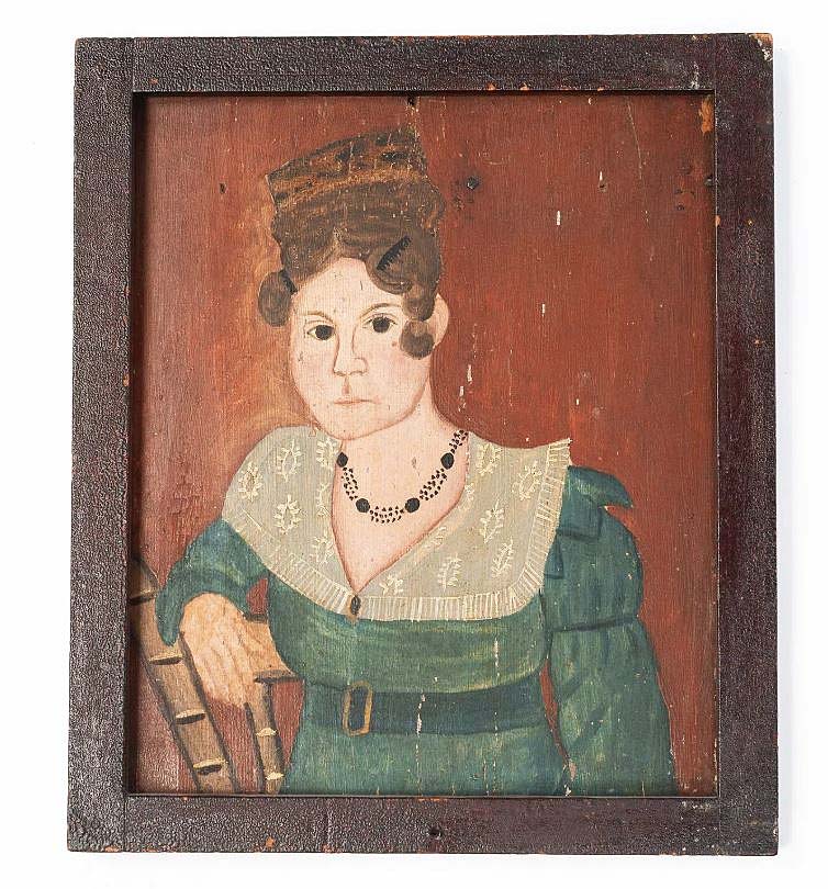 This early Nineteenth Century American School portrait of a woman, painted in oil on a wood board in a painted frame measuring 13¼ by 11½ inches, was from the Kruizenga collection and made $5,658 ($300/600).