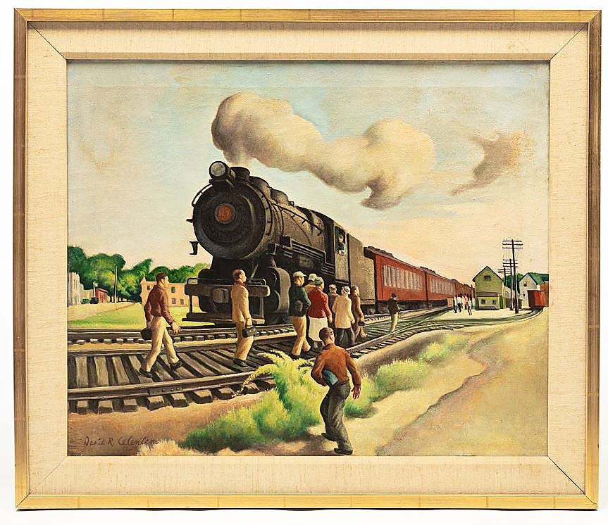 Daniel Ralph Celantano’s circa 1930 oil on canvas of an approaching train with figures, in a 19-by-23¼-inch frame, will be leaving Ohio with a trade buyer who paid $15,990 for it ($800-$1,200).