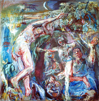 The right-hand panel depicts Prometheus as punished by Zeus, chained to a rock with an eagle pecking at his liver. The left-hand panel, however, offers some sense of hope and regeneration with Persephone springing out of the clutches of Hades, who had abducted her, aided by her mother Demeter, who stands between them. In a late alteration to the panel, Kokoschka painted the figure of Hades as a self-portrait, adding a further layer of complexity to the work.