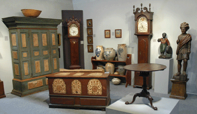Raccoon Creek from Oley, Penn., had one of the large booths and filled it with carvings, painted furniture, a selection of fabrics and lots of smalls. The standout piece, however, was a large sculpture by Noah Weiss, circa 1870‱880, titled “Birds in the Woods.” This carved and polychrome work came from Berks County and was magical with a large mirror surrounded by trees and birds, all colorful, fanciful and entertaining. In addition to the large center piece, two side panels fashioned as tree stumps with foliage and birds flanked the main piece. It was difficult to move away from this piece, but also offered was a miniature blanket chest from Berks County with brown sponge decoration over the original salmon ground, circa 1840‱860. A New Jersey folk art shelf with whimsical design and original paint and shellacked surface dated circa 1780‱790.