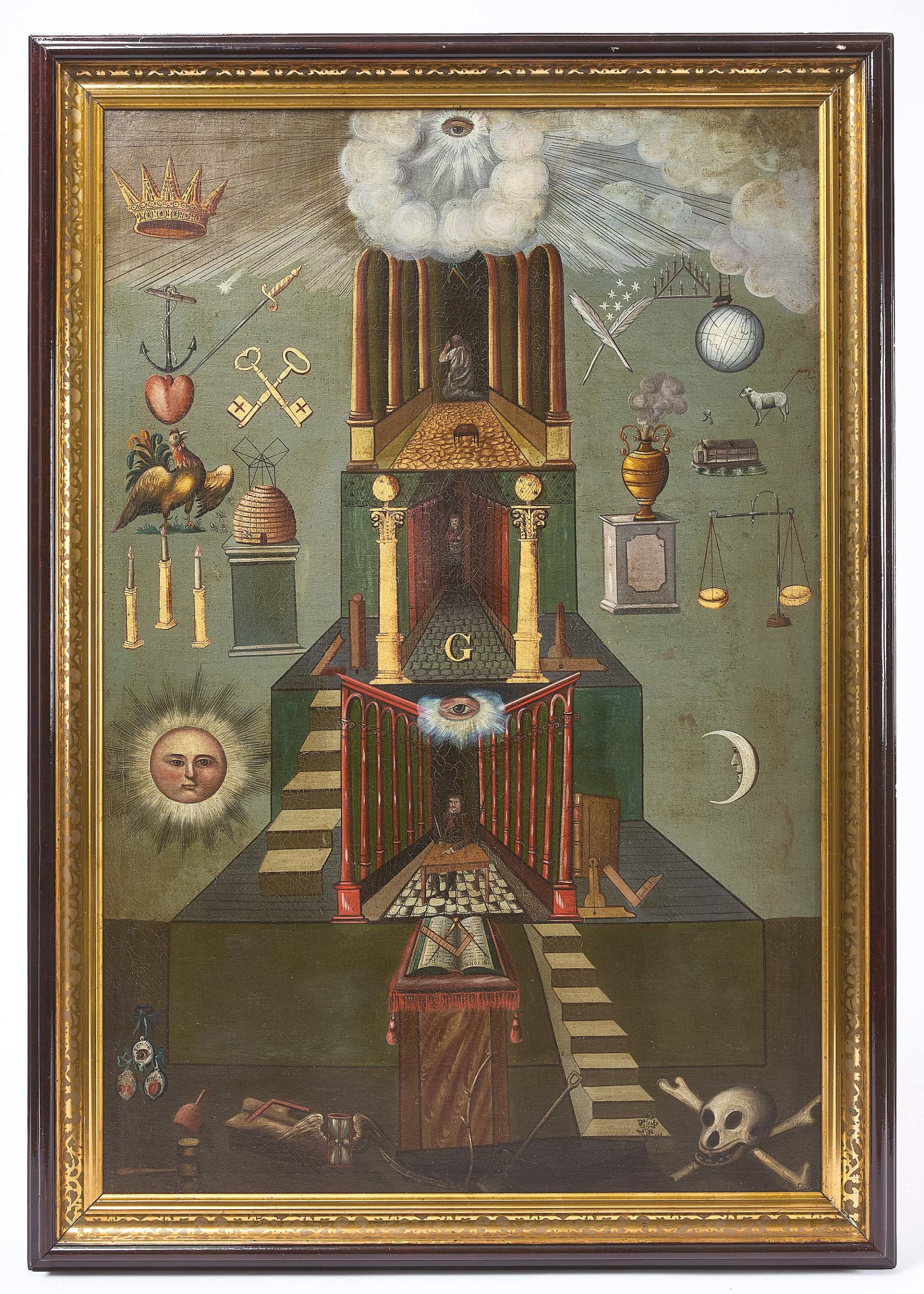 Achieving the sale’s highest price overall was this Masonic tracing board by Ezra Ames (New York, 1768-1836), “Hamilton D,” oil on canvas, 57½ by 40¼ inches in later frame; it was bid more than four times its high estimate to realize $37,800 ($4/8,000).