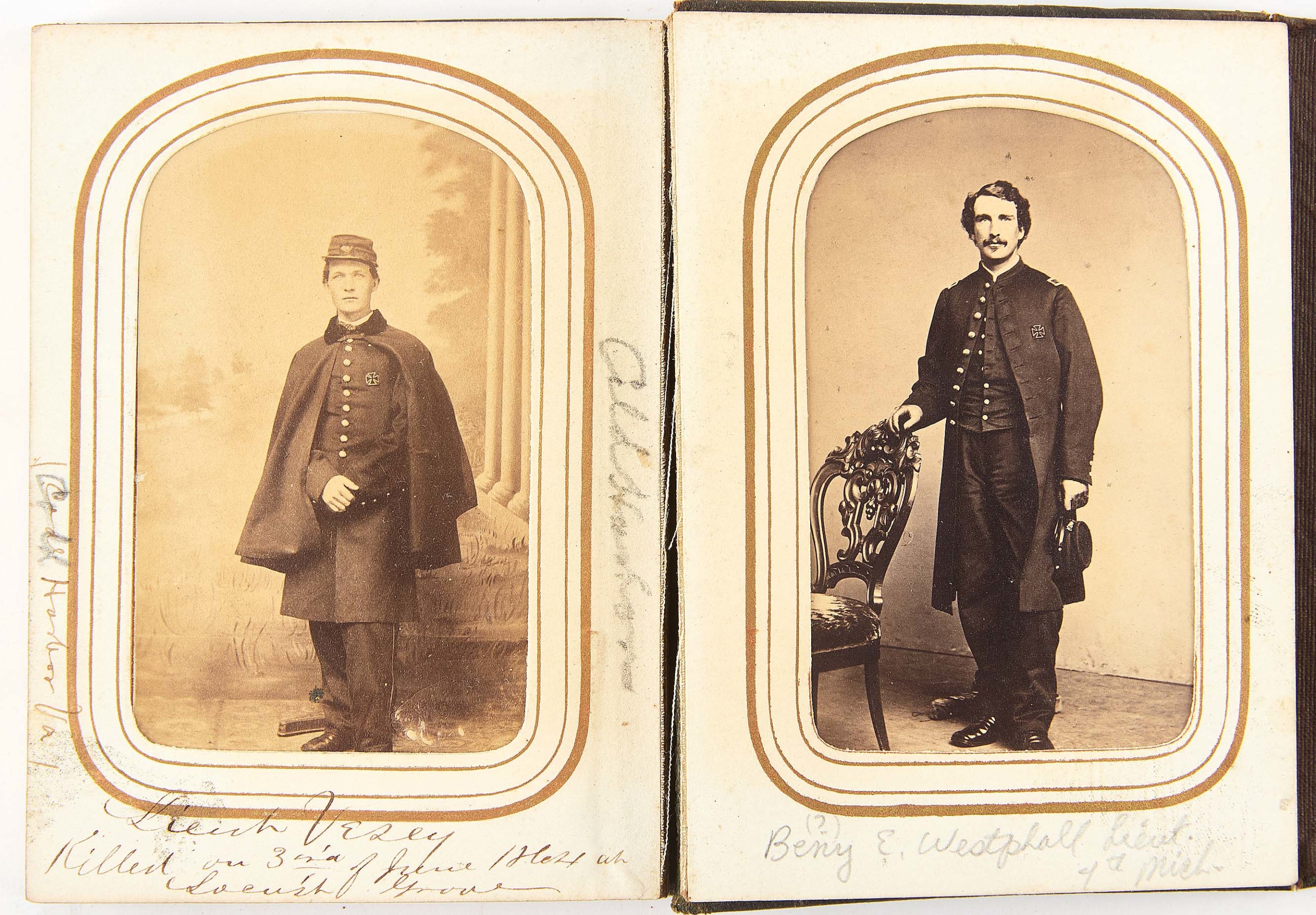 The photography selection was topped at $7,623 by three circa 1870 American CDV/tintype albums, one with military content and signatures, as these pages show ($250/500).