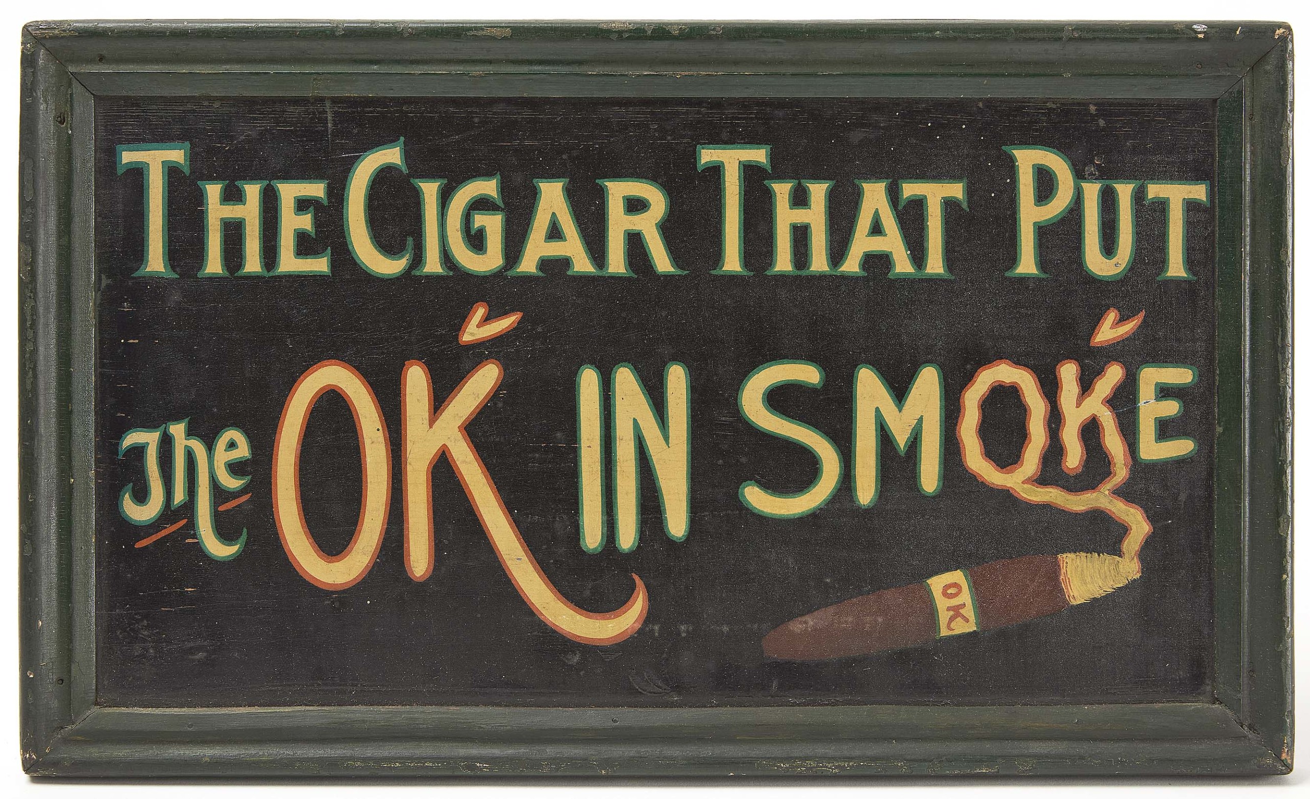 Early trade signs and tin lithographs primarily made up the third and final section of the auction; however, the selection was led by a cigar store figure that realized the auction’s second-highest price overall: $32,760. Crafted by “John & Simeon Skillin, Boston,” as identified on a silver plaque affixed to the figure’s back, this carved Black boy wore a tunic and held an apple in one hand and cigars in the other. Another cigar store item, this one a trade sign, exceeded estimates to achieve $6,300. The circa 1900 American sign read “The Cigar The Put the OK in Smoke” and featured a smoking cigar labeled “OK.”