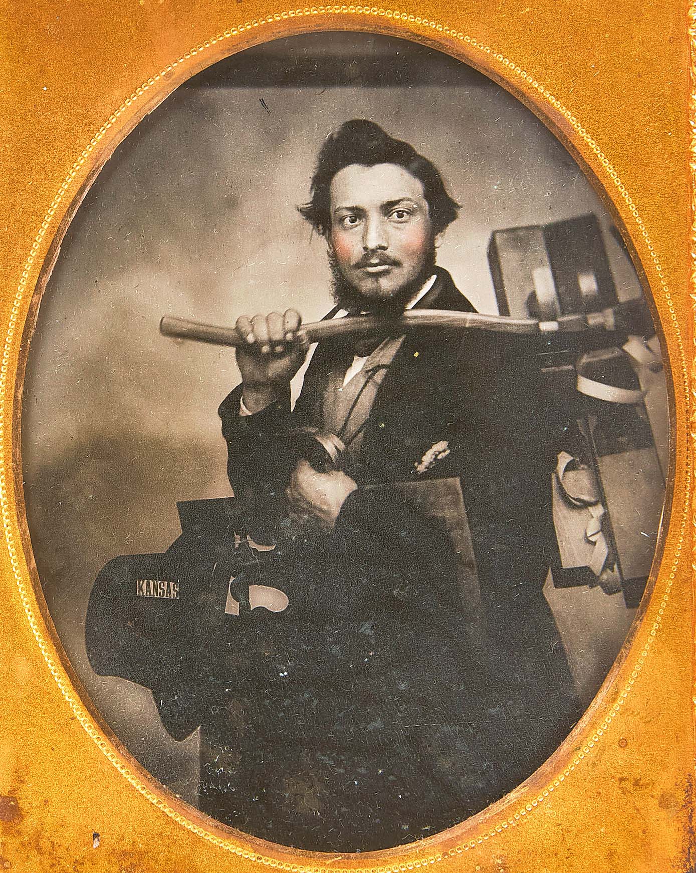 Featuring a man seated with two portrait paintings, this sixth plate daguerreotype, American, circa 1845, 3¾ by 3¼ inches cased, brought $1,890 ($250/500).