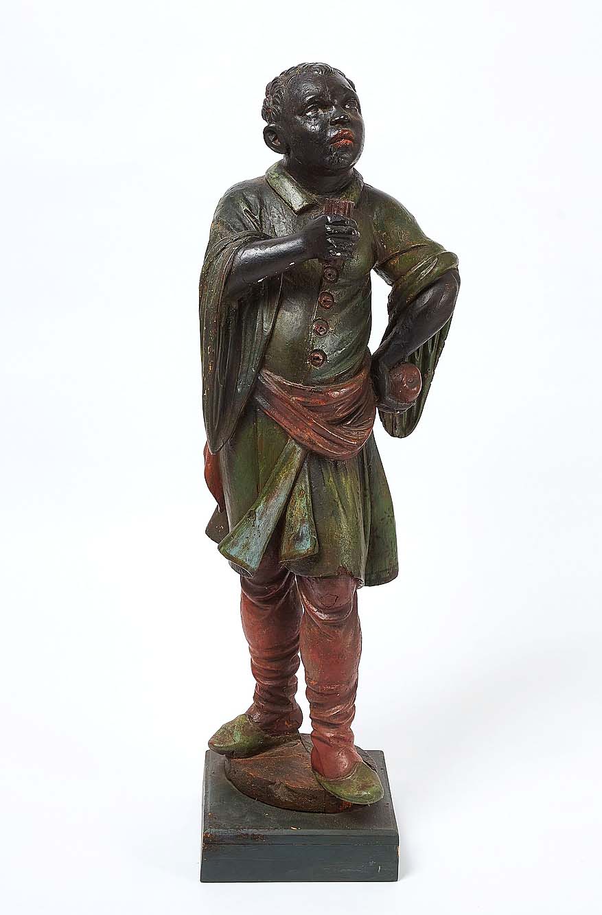 Early trade signs and tin lithographs primarily made up the third and final section of the auction; however, the selection was led by a cigar store figure that realized the auction’s second-highest price overall: $32,760. Crafted by “John & Simeon Skillin, Boston,” as identified on a silver plaque affixed to the figure’s back, this carved Black boy wore a tunic and held an apple in one hand and cigars in the other. Another cigar store item, this one a trade sign, exceeded estimates to achieve $6,300. The circa 1900 American sign read “The Cigar The Put the OK in Smoke” and featured a smoking cigar labeled “OK.”