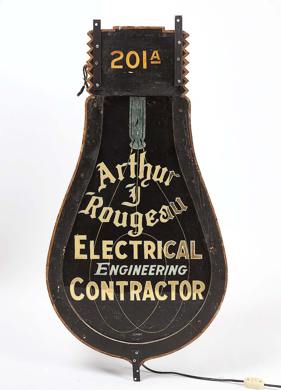 Other trade signs included a circa 1940 European electrified lightbulb-shaped wood and glass sign for “Arthur J. Rougeau / Electrical Engineering Contractor” and an American oversized hanging three-dimensional tooth marking an early dentist’s office, circa 1880. These earned $5,460 and $4,680, respectively.