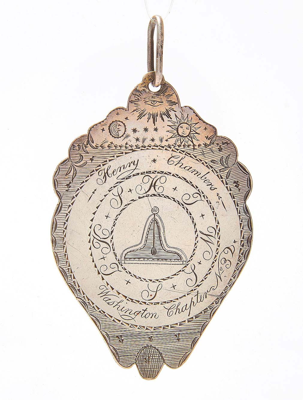 Another item from the lodge was a Chinese export porcelain bowl that had been decorated with celestial Masonic symbols. Also featured in Symbols in the Wilderness, this bowl had images of the sun, moon, seven stars, comets and the pillars of Jachin and Boaz on the inside while the exterior had clusters of imagery, including the compass and square, beehives, ashlar and more. It exceeded its $1,500 high estimate, bringing $2,772.