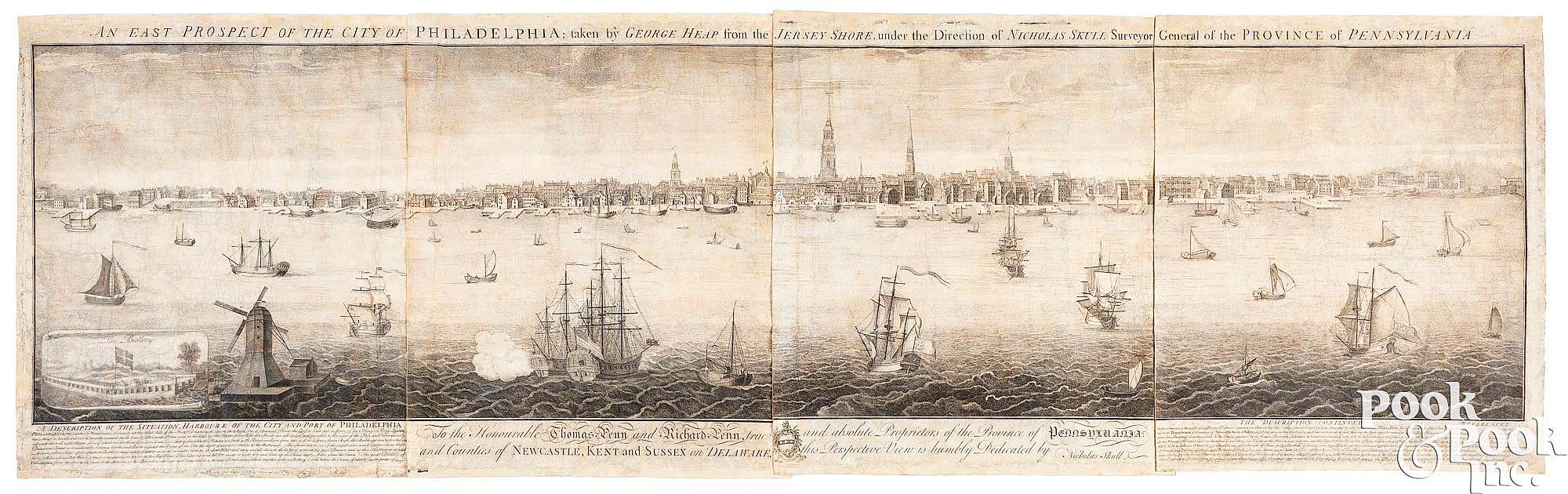 This 84-inch-long “Prospect of the City of Philadelphia” by George Heap and Nicholas Scull, panoramic engraving by Gerard Vandergucht (1696-1766), London, 1754, on four 25¼-inch-high folio sheets of laid paper, displayed a $212,500 result ($200/300,000).