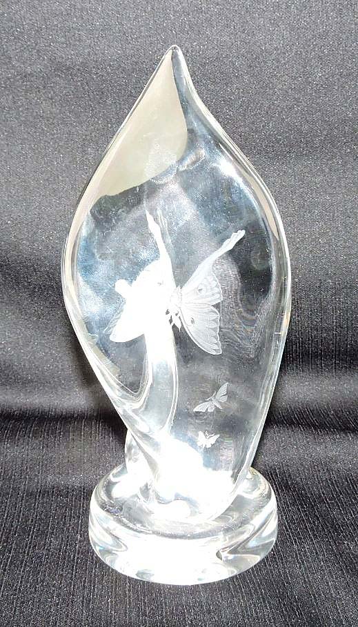 Besting nearly 400 other lots of antique and vintage glass, this Steuben crystal spire sculpture had engraved butterflies and came with a fitted case. At $1,430, it led the Glass auction ($800-$1,200).
