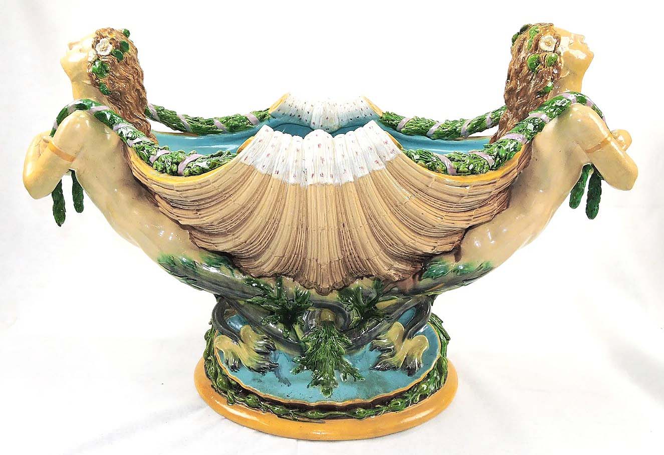 Professional repairs to both the mermaids and base of this Minton majolica shell-form centerpiece did not discourage bidders from taking it to $8,250 ($4/6,000).