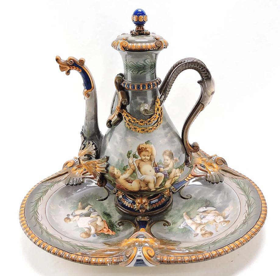 Surviving with its stand, this circa 1850 KPM Royal Berlin ewer was decorated with cherubs, dragons and grapes. It topped the October 25 Ceramics auction at $2,310 ($1/1,500).