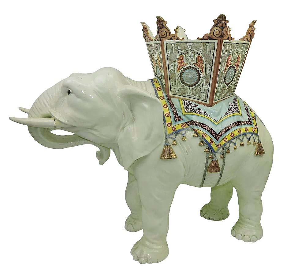 Naturalistically modeled, this Delphin Massier elephant floor jardiniere, circa 1880, measured 30½ inches in height and brought $8,800 from a long-standing Strawser private collector to lead the majolica sale ($4/6,000).