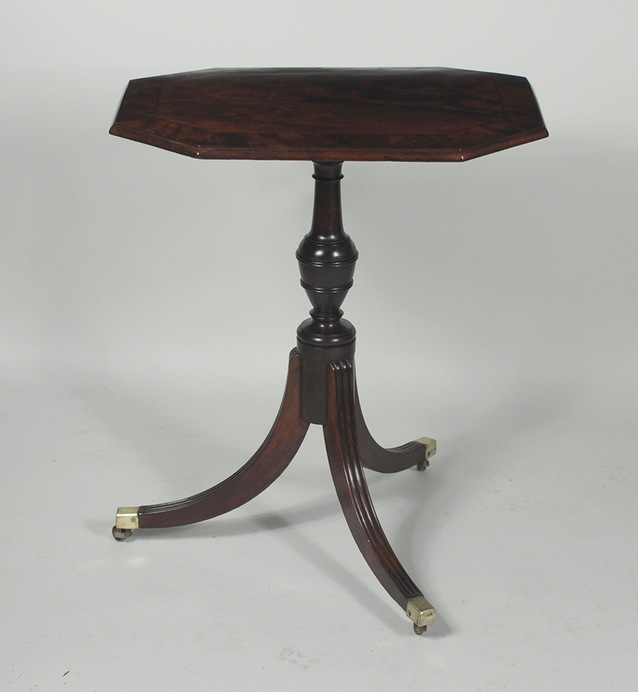 Very fine federal figured mahogany tip top table, with octagonal top with ebony stringing and broad crossbanded edge, set on an urn form column raised on molded sabre legs ending in brass casters. Probably Massachusetts, circa 1800-10. 22" wide, 13" deep, 29" high.