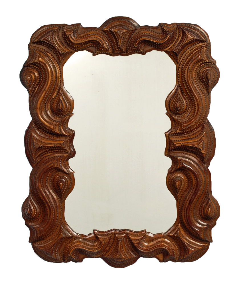 Impressive tramp art mirror with a swirling design. Very fluid and extremely unique design elements for the art form. With original mirror. Similar examples apparently by the same hand are found in A Legacy in Tramp Art on the title page and on page 95. Size: 24” high x 18.5” wide. Price: $3900.00