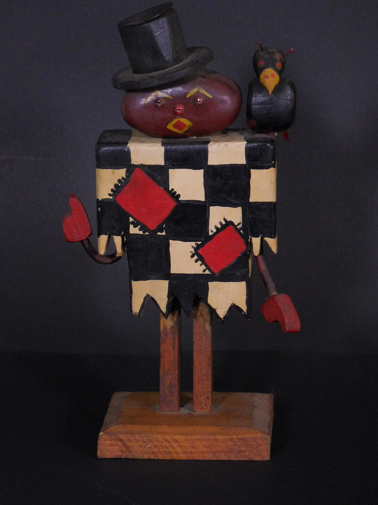 Folk art carved and painted man with bird on his shoulder. Steven F Still Antiques Manheim, PA 717-459-3595 www.stevenfstillantiques.com/ Steven@StevenFStillAntiques.com