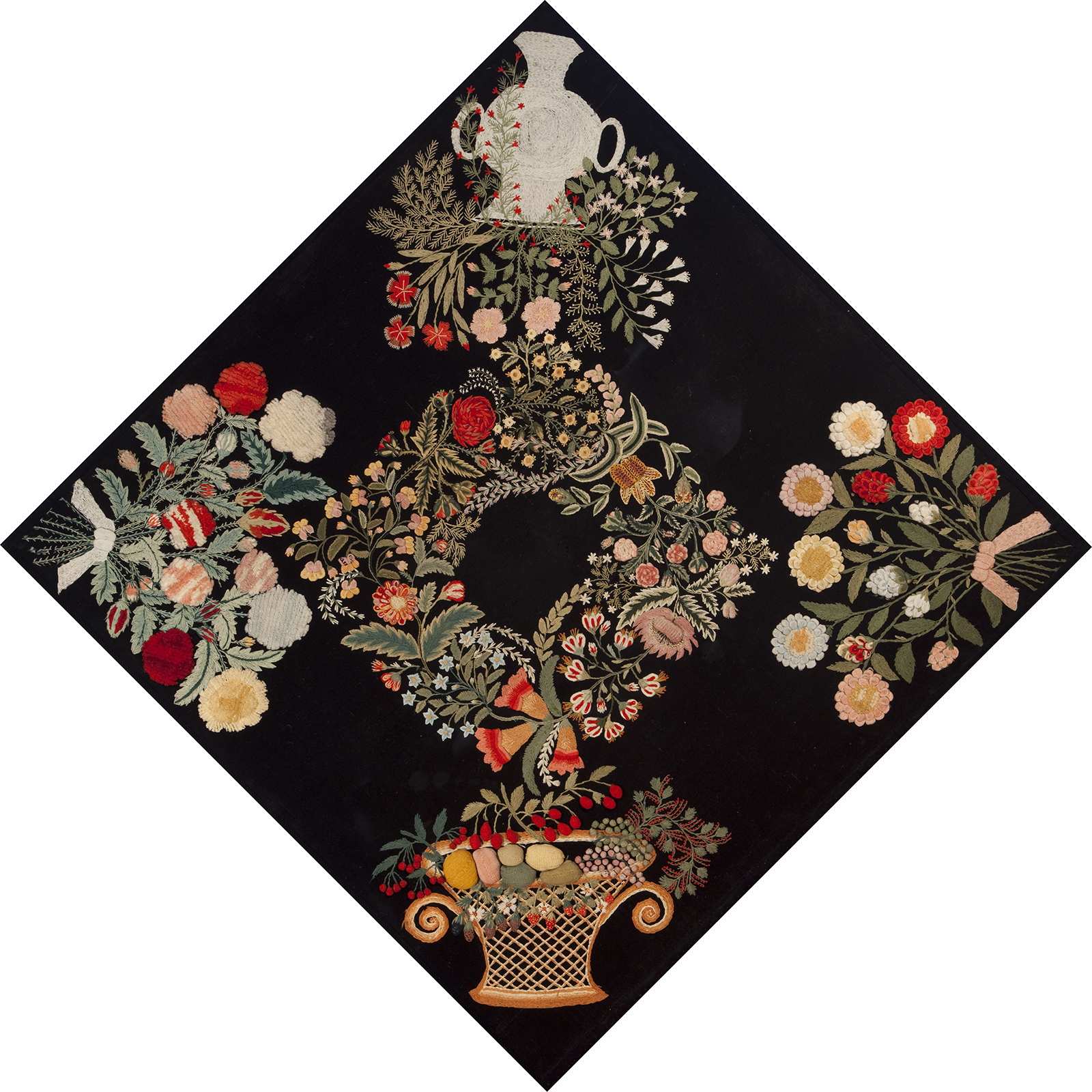 A Dynamic Raised-Work Table Cover of Exceptional Intricacy and Sophistication American, found in Maine; third quarter of the 19th Century. A wool on wool embroidered and appliqued raised and stuffed work table cover depicting bold and colorful baskets and bouquets of flowers. The artist has created a "painting on fabric" with imaginative techniques, designs, and choice of colors. 54 inches square. Frank & Barbara Pollack Highland Park, IL 847-433-2213 barbarapollack@comcast.net