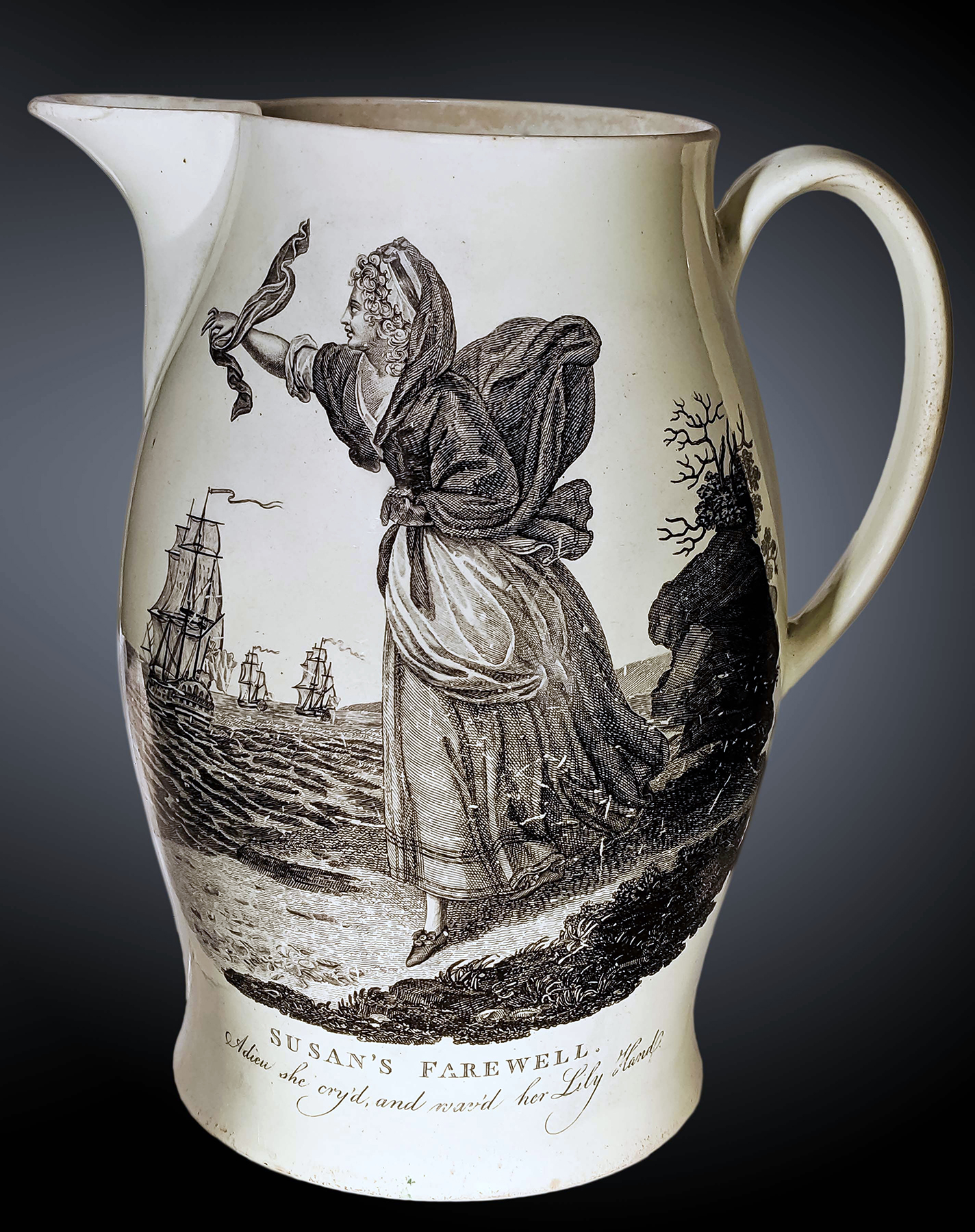 Liverpool creamware of "Susan's Farewell" from the love story and poem of John Gay’s “Black-Eye Susan & Sweet William,” English, Eighteenth Century. Size: 9½ inches high. For more photos, visit www.leatherwoodantiques.com under: Antique Pottery (Inc Creamware & Pearlware). Leatherwood Antiques Sandwich, Mass. 508-420-1433 info@leatherwoodantiques.com www.leatherwoodantiques.com/