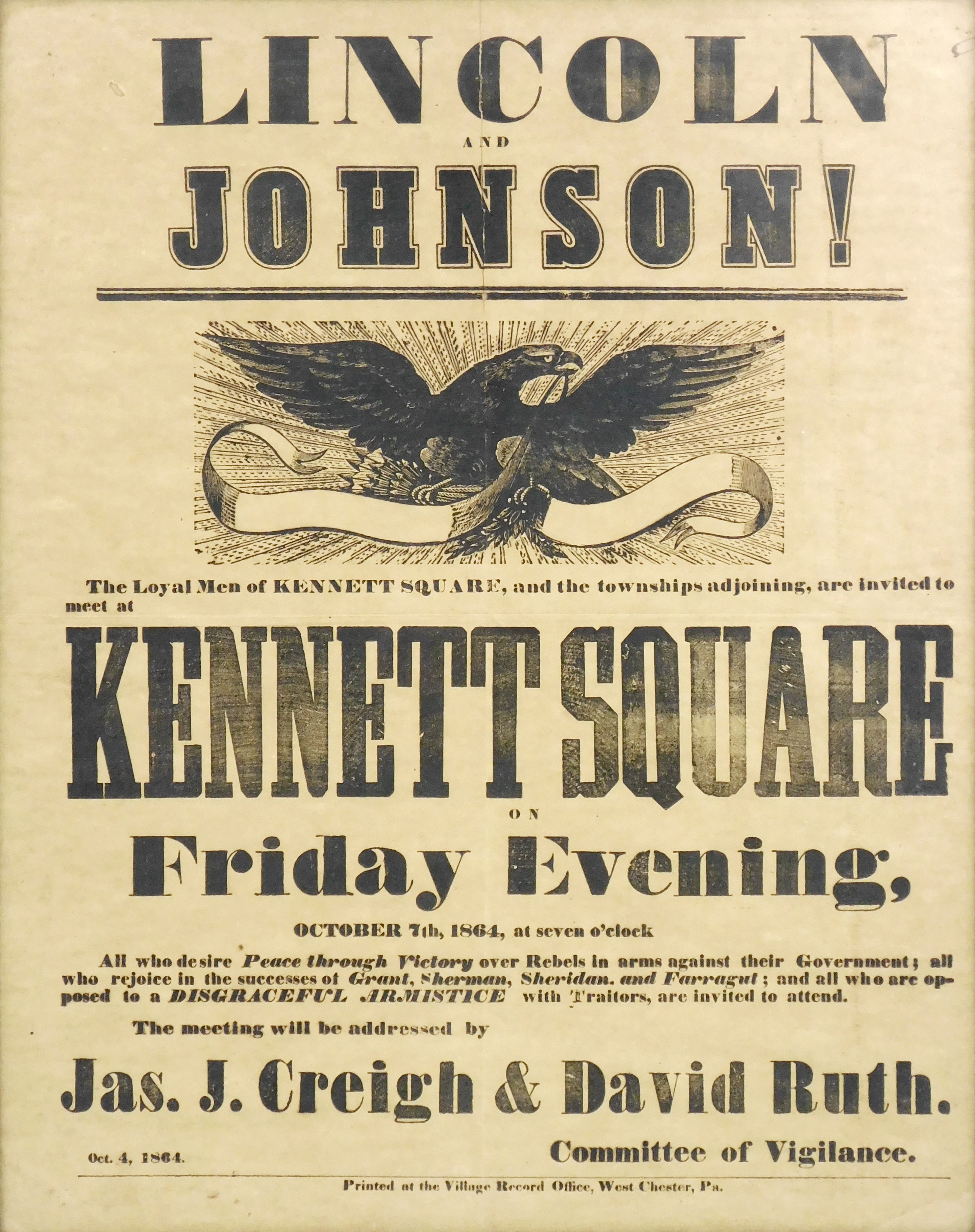 EPHEMERA: Abraham Lincoln and Andrew Johnson Pennsylvania Political/ Campaign 1864 broadside, printed on yellow paper titled "Lincoln and Johnson" above eagle woodcut, text below reads "The Loyal Men of KENNETT SQUARE, and the townships adjoining, are invited to meet at KENNETT SQUARE on Friday Evening, October 7th, 1864 at seven o'clock, All who desire Peace through Victory over Rebels in arms against their Government; all who rejoice in the successes of Grant, Sherman, Sheridan, and Farragut; and all who are opposed to a DISGRACEFUL ARMISTICE with Traitors, are invited to attend. The meeting will be addressed by Jas. J. Creigh & David Ruth, Committee of Vigilance, Printed at the Village Record Office, West Chester, Pa.", in 20th C. frame behind glass, past wear including folds, separation at top center through eagle, some holes, sold as found, ss: 23 1/4" h. x 18 5/8" w.