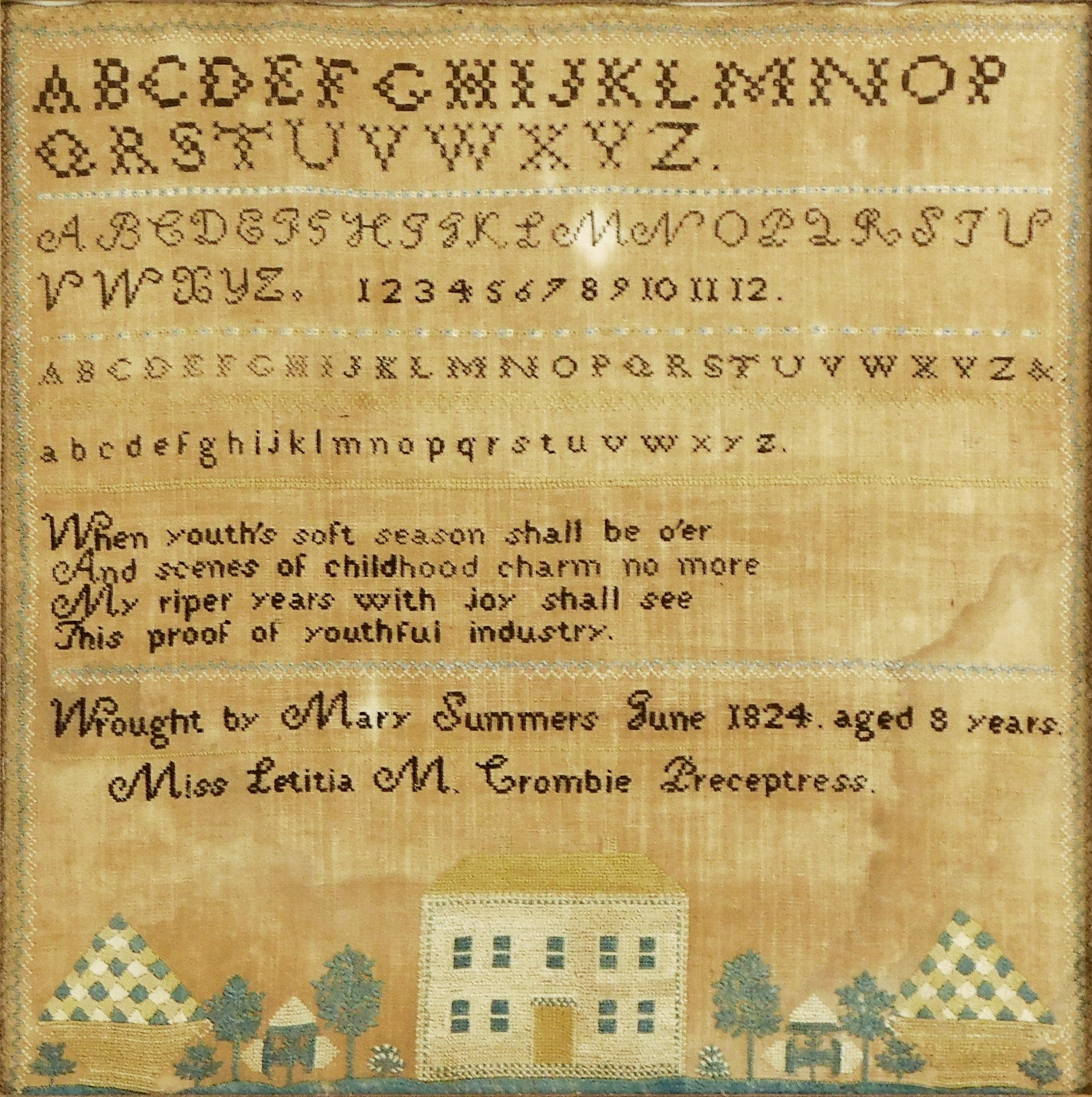 1824 Needlework sampler by Mary Summers, aged 8 years, worked “Letitia M. Crombie Preceptress”- $200 - $400 ESTIMATE
