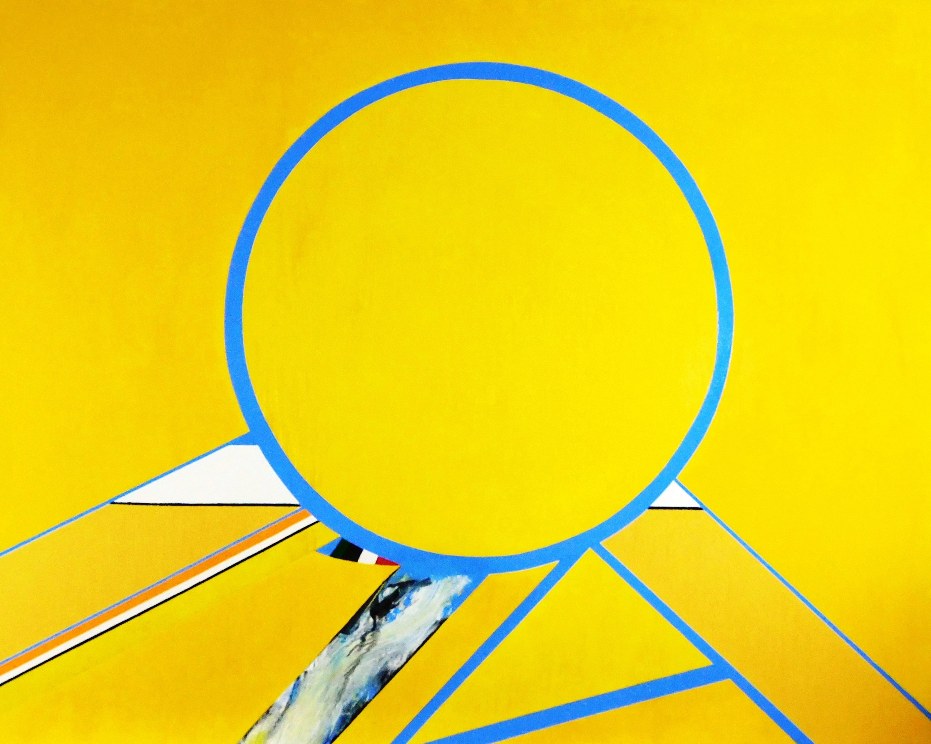 Budd Hopkins (American 1931-2011), “Montezuma V”, 1971, oil on canvas, overall bright yellow composition with large central circle outlined in blue and other colors with a block of textural finish descending from circle, signed and dated lower left “Hopkins ‘71”, in minimal wood frame, wear consistent with age, ss: 40” h. x 52” w. [PROVENANCE: Copy of 1974 receipt from William Zierler Inc. for $2,800 available to successful buyer.]