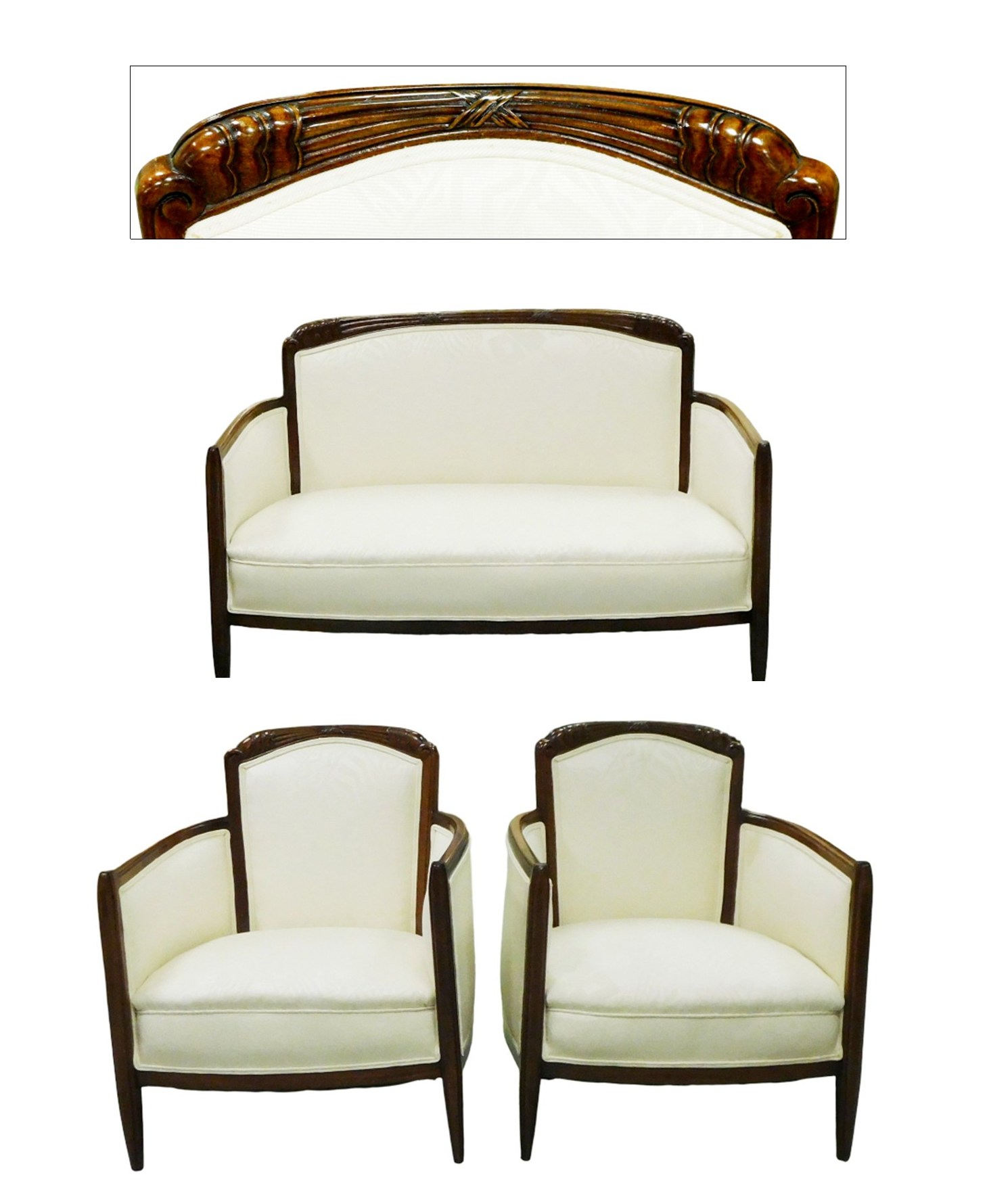 French Art Deco salon suite attributed to Louis Sue and Andre Mare, c. 1922, three pieces including small sofa and two bergeres, mahogany frames with carved detailing to crests, upholstered in cream-colored fabric with subtle two-tone geometric motif, wear consistent with age and use, sofa: 48" l.; chairs: 30" h. x 25" w. x 22" d. [PROVENANCE: Identified as Louis Sue in an 1985 appraisal by Gerard Widdershoven of Maison Gerard, New York. Purchased through inter-space design for $9,800 in 1985. Copy of decorator's receipt and appraisal available to successful bidder.]
