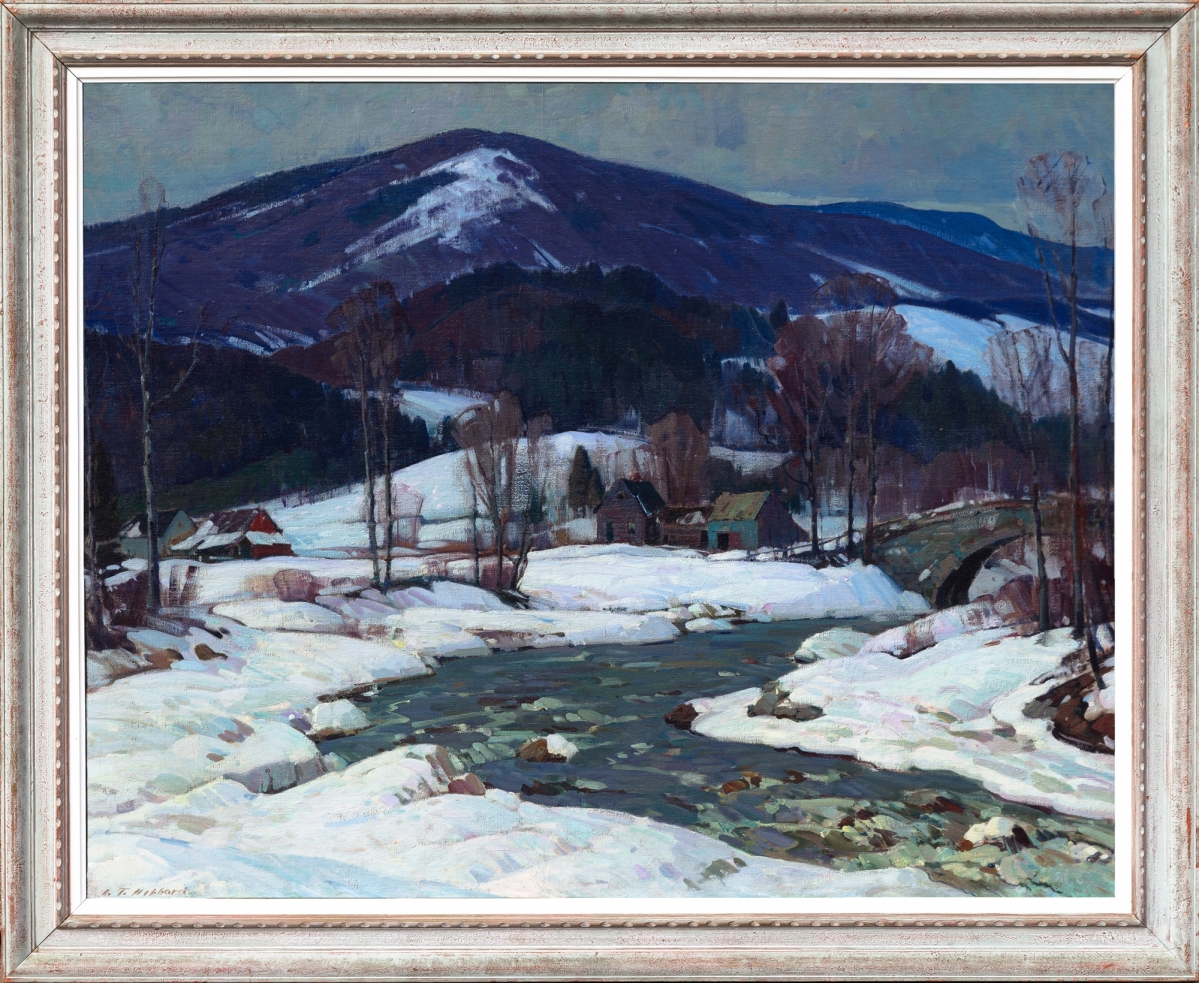 An oil on canvas winter scene by Aldro Thompson Hibbard (American, 1886-1972), purchased directly from the artist’s wife, was signed lower left. The 40-by-50-inch work, which Hibbard donated for a baseball team benefit at the Rockport Art Association – thus becoming known as the “baseball painting” – realized $43,600. The raffle winner sold the painting back to Hibbard where it remained for the rest of his life.