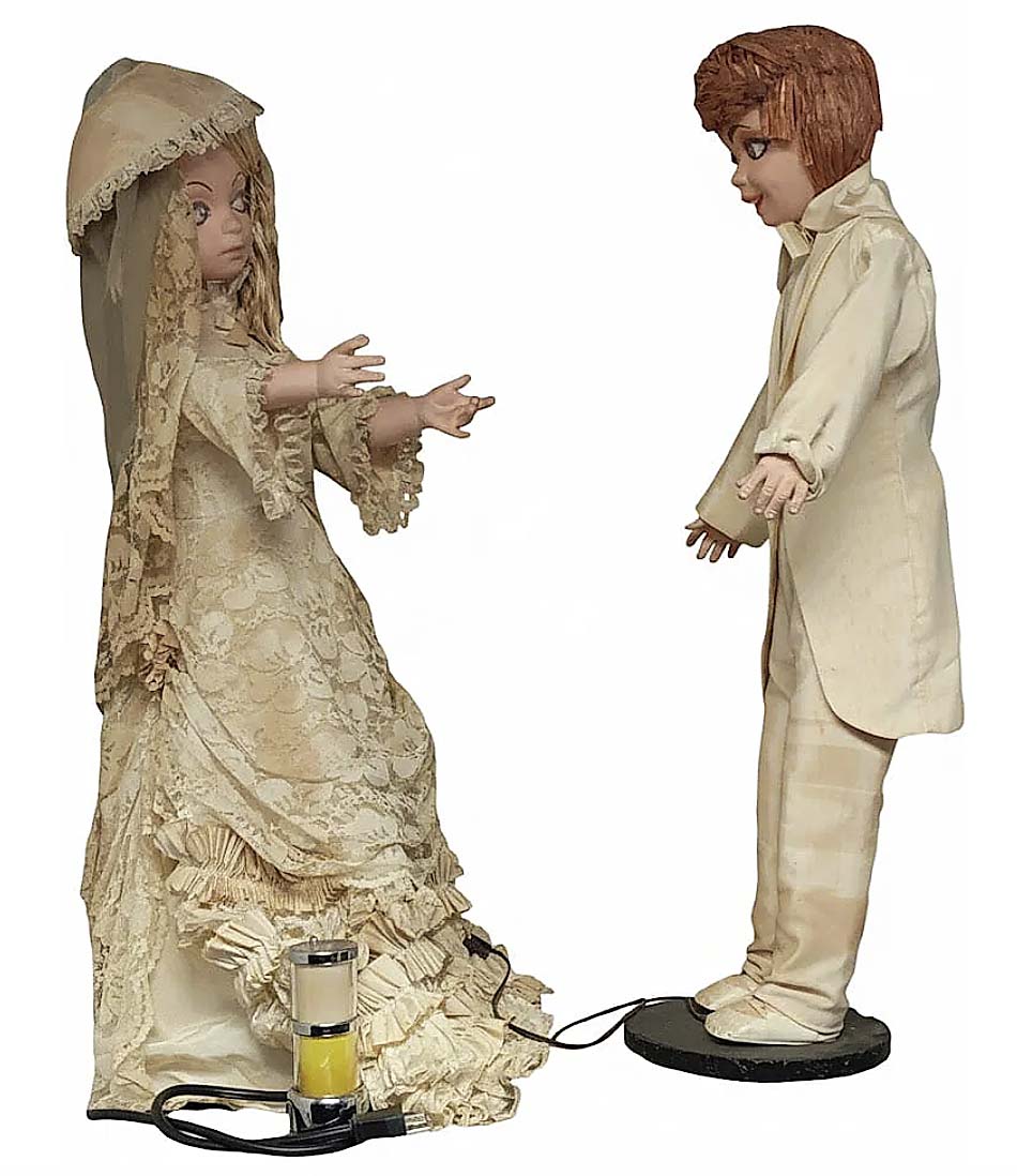Fantastical window displays continue to be a major part of the holiday season, and a pair of animated dolls contemporary to the cast iron stove might be coming out of retirement this Christmas. The dolls were most likely made in Germany, showing bisque faces and retaining their original wedding-themed outfits. Despite some discoloration and wear on their clothing, they were in good overall condition and sold together for $500.